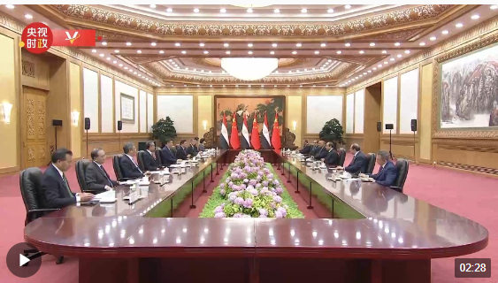 习近平指出,欢迎总统先生访华并出席中阿合作论坛第十届部长级会议开幕式。借此机会,我对你再次连任总统表示诚挚祝贺。今年是中埃建立全面战略伙伴关系10周年。10年来,我同总统先生先后11次会面,共同引领双边关系蓬勃发展。中埃关系已经发展成为中国同阿拉伯、非洲、伊斯兰和发展中国家团结协作、互利共赢的生动写照。