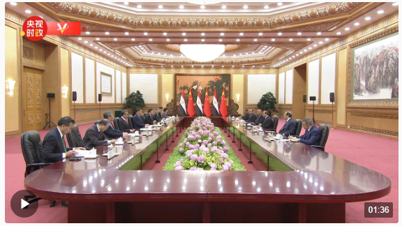 塞西说:“尊敬的习近平主席,首先请允许我向您表示我们的崇高敬意,向中国人民表示崇高的敬意。我也非常高兴能够应您的邀请对中国进行国事访问,并出席中阿合作论坛部长级会议。此次访问也恰逢埃中两国建立全面战略伙伴关系10周年。”