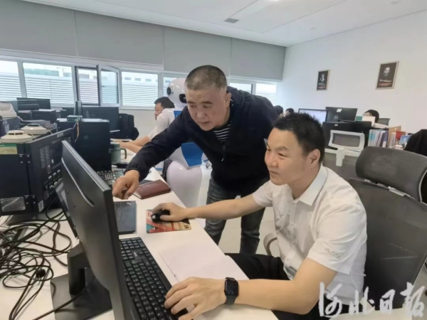 5月23日,在秦皇岛泰和安科技有限公司,科技特派团刘永山团队的孟凡卓老师(站立者)在指导企业技术人员完善消防设备物联网服务管理平台功能。河北日报记者 孙也达摄