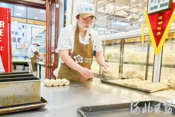 5月23日,在中秦兴龙广缘超市内,烘焙工人徐爱静在制作西点。河北日报记者 孙也达摄