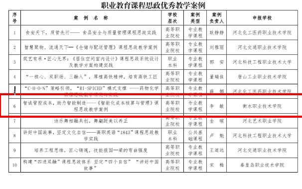 近日,河北省教育厅发布了《河北省教育厅关于公布2023年职业教育思政课程和课程思政“五个一批”建设项目遴选结果的通知》(冀教职成函〔2024〕21号),衡水职业技术学院荣获“职业教育课程思政优秀教学案例”和“职业教育德育工作骨干管理人员”各一项。