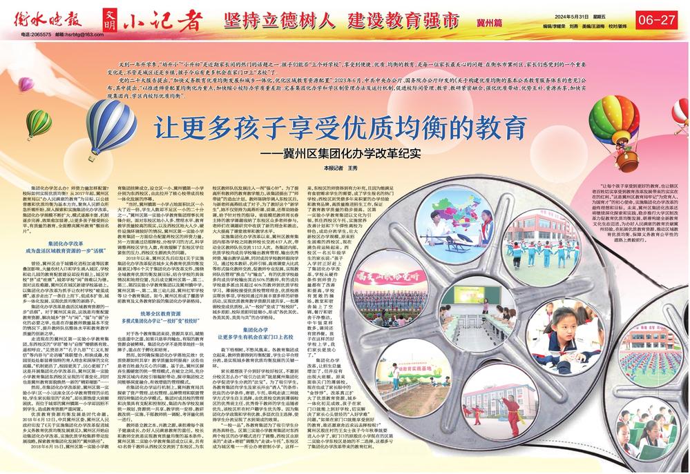 基本方向,聚焦人民群众所急所需所盼,深入探索和实施集团化办学改革,集团化办学规模不断扩大、模式逐渐丰富、机制逐步完善、效果愈加显著,让更多孩子接受到公平、有质量的教育,全面擦亮冀州教育“靓丽名片”。