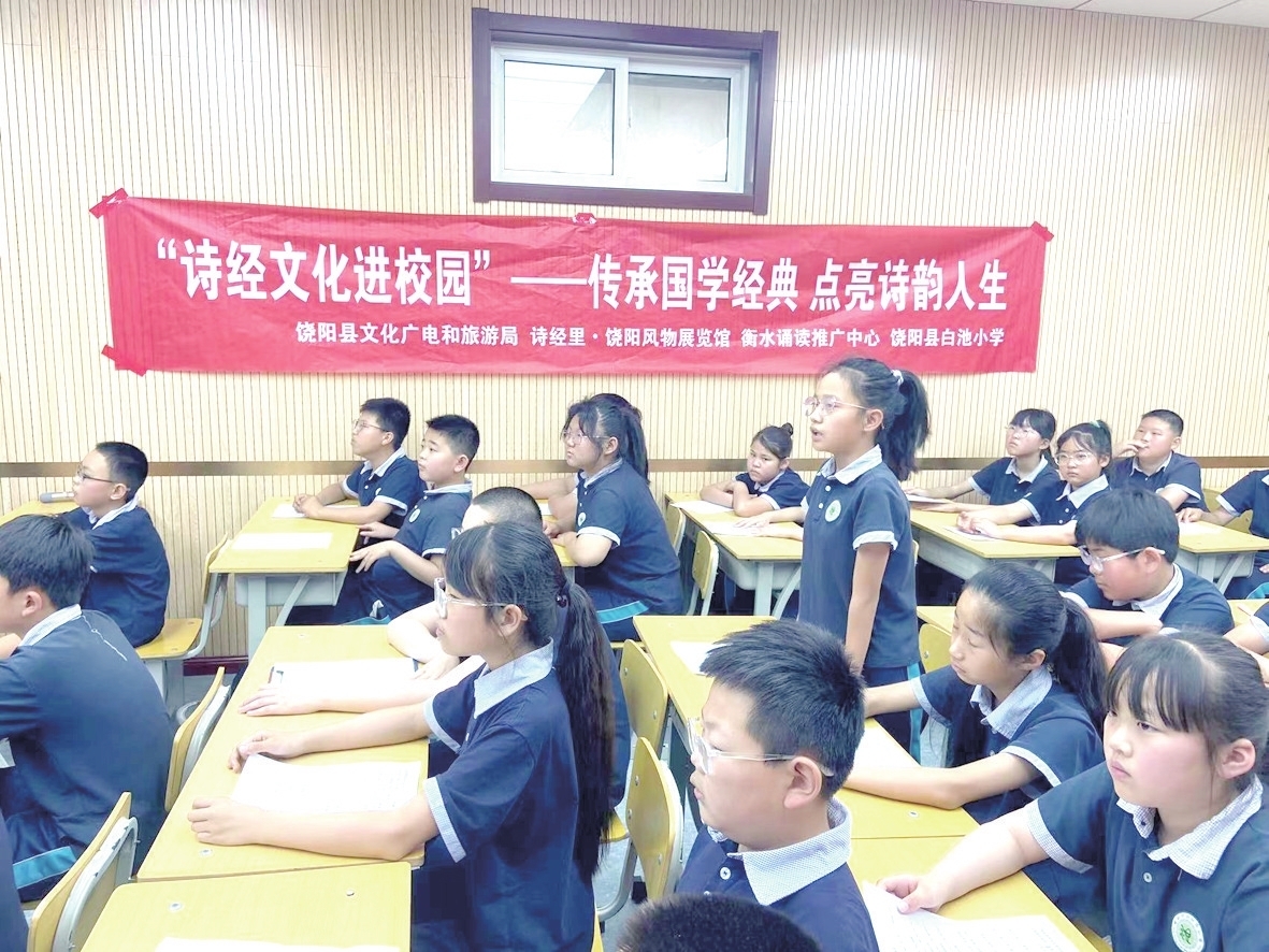 饶阳县教育局为引导学生探寻文化魅力,更好地传承和弘扬中华优秀传统文化,让国学经典、书法等传统文化走进了课堂。在白池小学,一二年级阅读《弟子规》《三字经》,三四年级阅读四书五经,五六年级阅读小古文,朗朗读书声成为每天早晨最动听的主旋律,还开展了讲故事比赛、合唱比赛、读书活动等。饶阳县作为“鼓乐之乡”,饶阳县第二实验小学倾力打造中国鼓学习环境,将中国鼓作为学校新晋艺术特色课程,让学生在锣鼓艺术的熏陶中领悟其博大精深的精神内涵,从而激发自我、坚定信念,并在鼓韵中热爱、传承灿烂的中华文化。