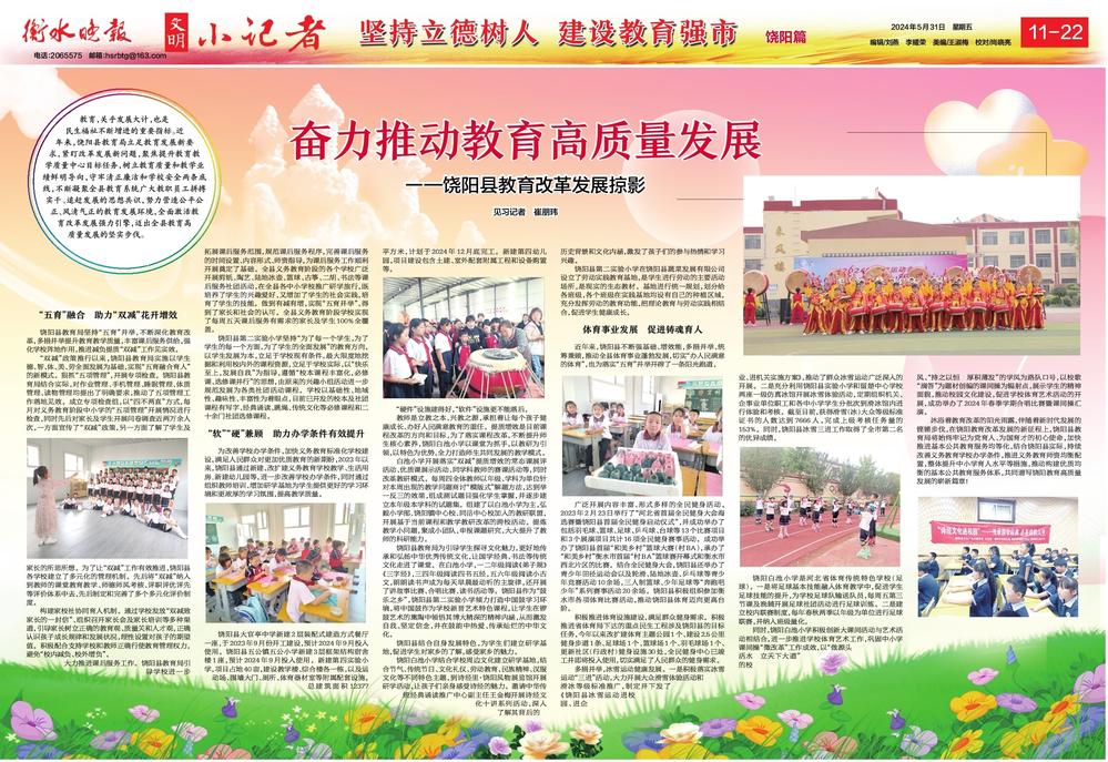 沐浴着教育改革的阳光雨露,伴随着新时代发展的铿锵步伐,在饶阳教育改革发展的新征程上,饶阳县教育局将始终牢记为党育人、为国育才的初心使命,加快推进基本公共教育服务均等化,结合饶阳县实际,持续改善义务教育学校办学条件,推进义务教育师资均衡配置,整体提升中小学育人水平等措施,推动构建优质均衡的基本公共教育服务体系,共同谱写饶阳教育高质量发展的崭新篇章!