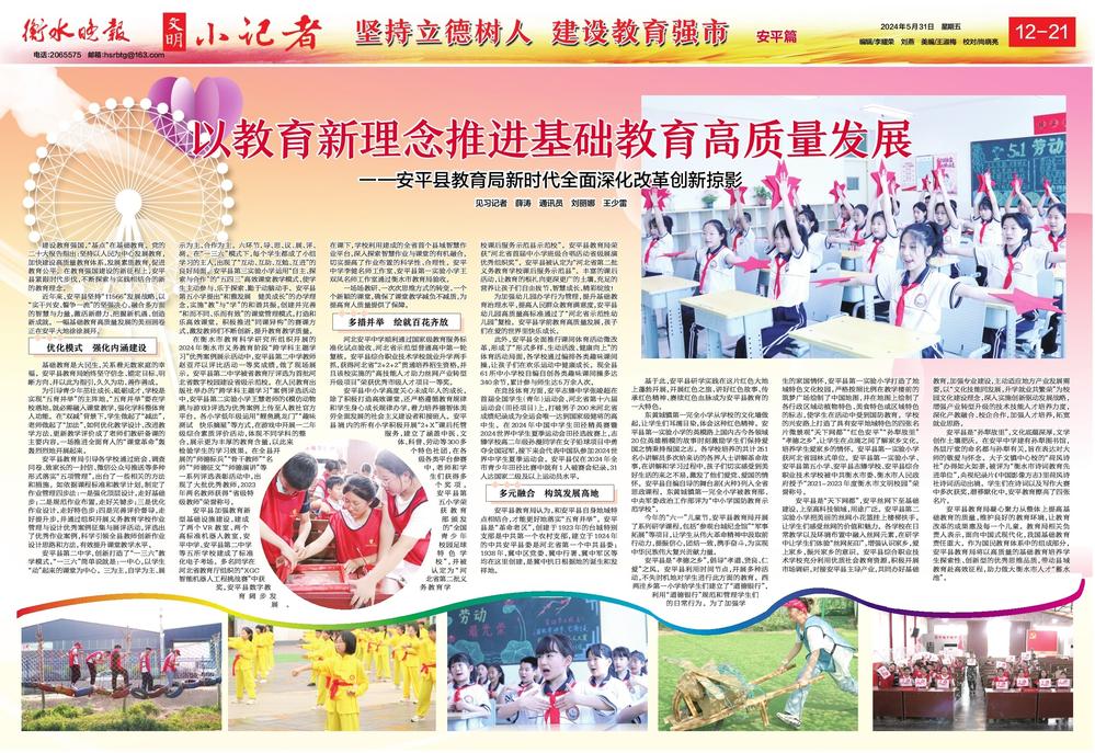 建设教育强国,“基点”在基础教育。党的二十大报告指出:坚持以人民为中心发展教育,加快建设高质量教育体系,发展素质教育,促进教育公平。在教育强国建设的新征程上,安平县紧跟时代步伐,不断探索与实践相结合的新的教育理念。