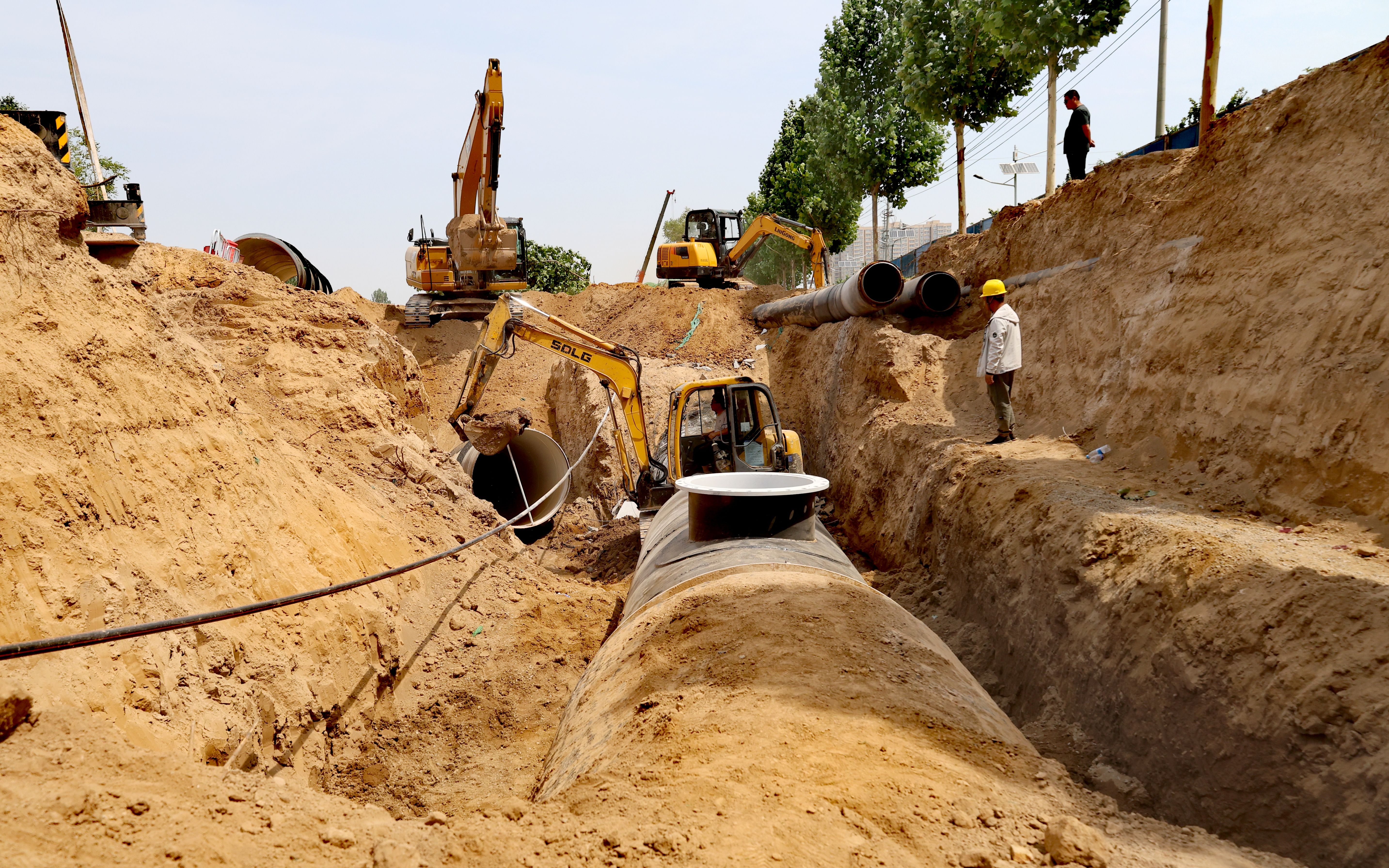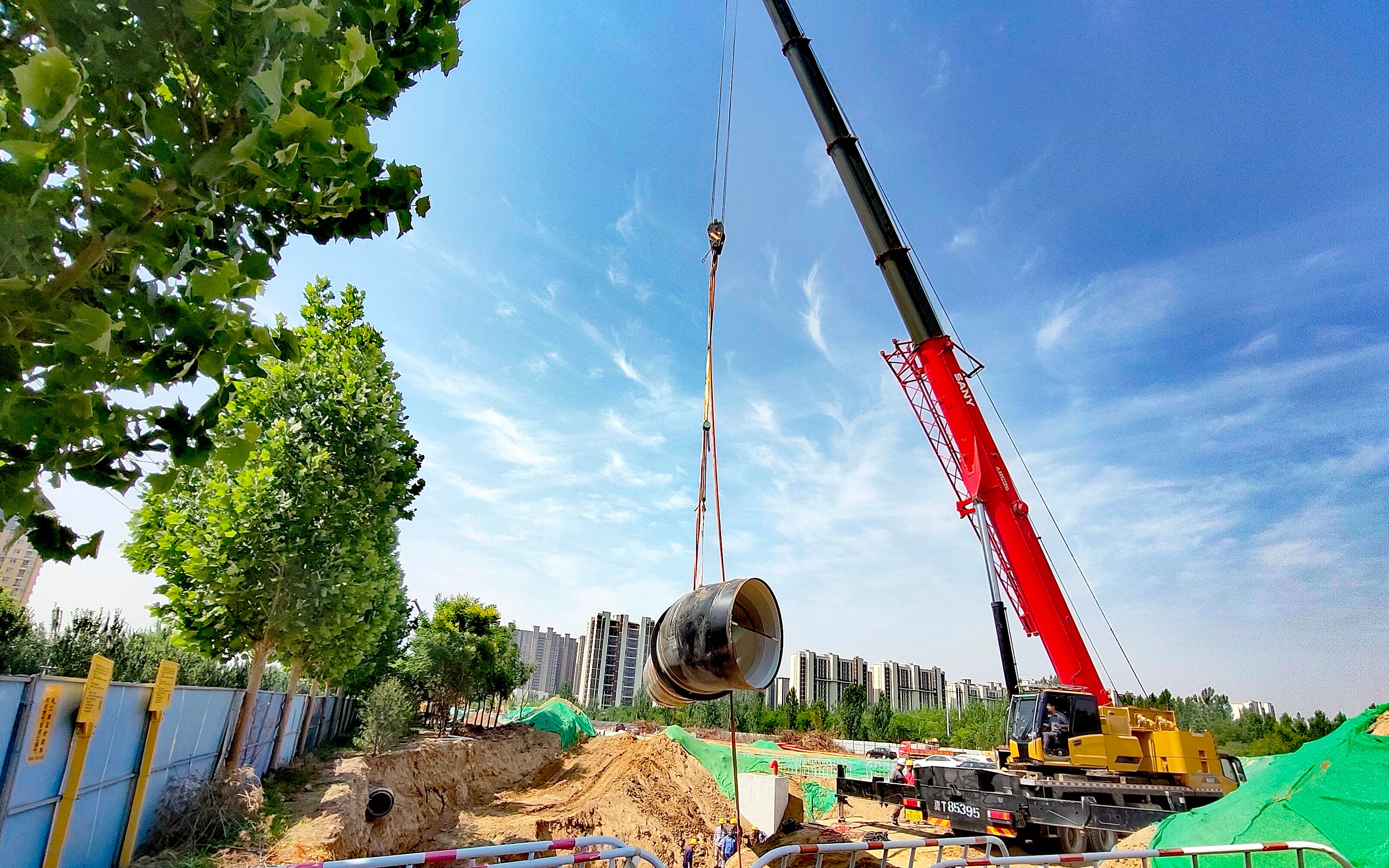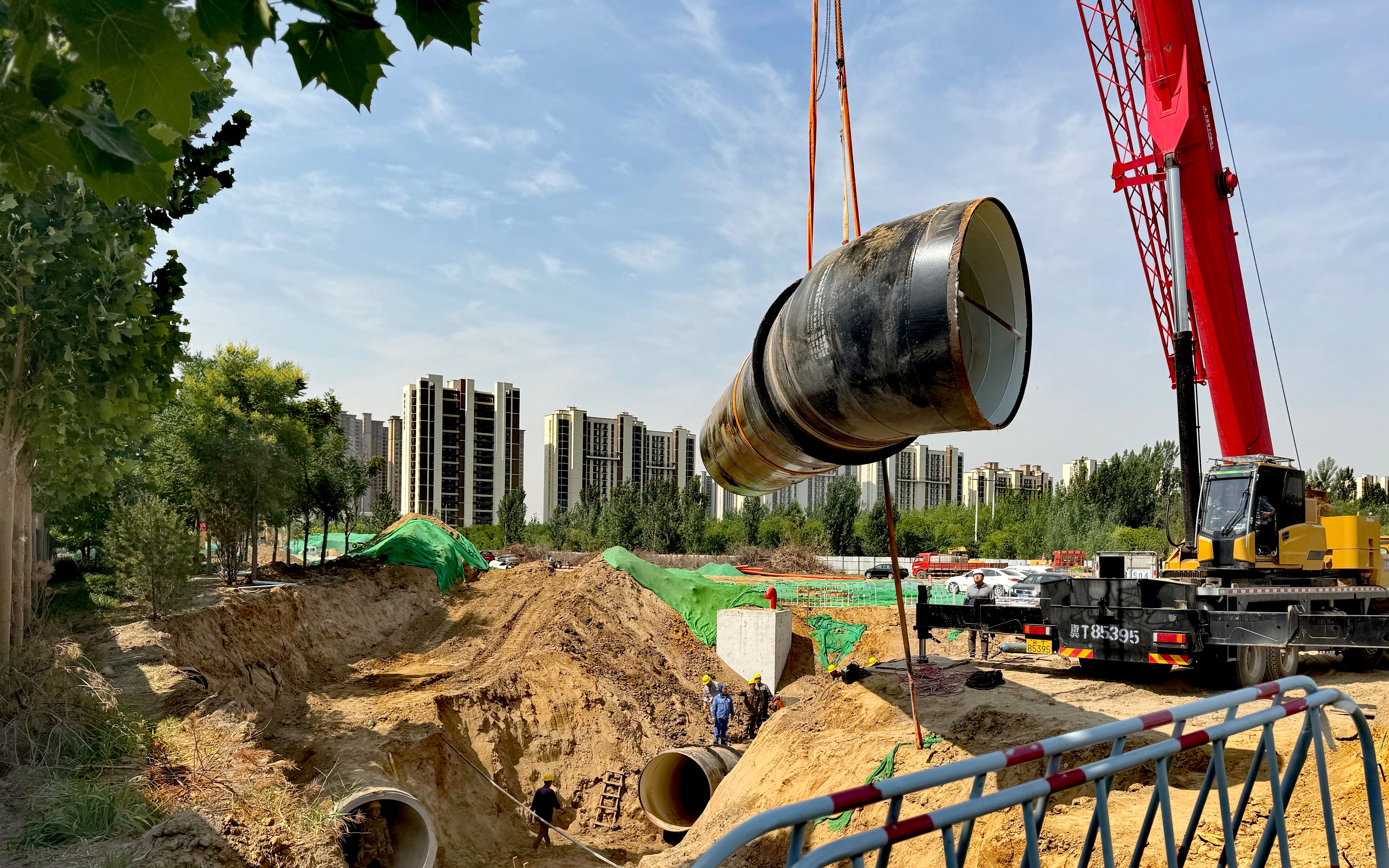 在施工现场,记者看到,挖掘机被起重吊装设备高高吊起,然后平稳进入深约5米的土坑内,开展清淤作业。随后,施工涉及阀门有序关闭,现场切割管道、基坑排水、碰通接头及焊接等作业依次有序进行。施工人员加紧脚步、争分夺秒,多台大型吊车、挖掘机等机械轮番作业,隆隆的机鸣声,四溅的火花,热火朝天的施工场面,奏响了雄商高铁衡水段建设的奋进凯歌。