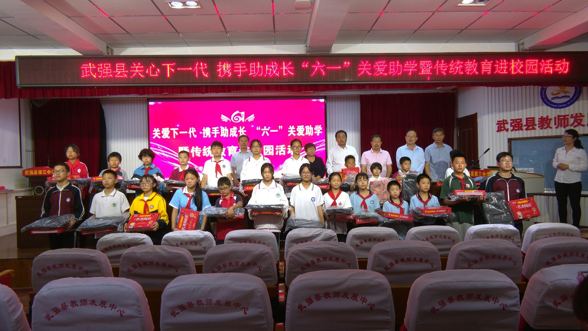 在“六一”国际儿童节来临之际,衡水市武强县关工委、县教今日育局、团县委、县妇联等部门在县第三中学联合举办了“关心下一代 携手助成长 ‘六一’关爱助学暨传统教育进校园活动”。
