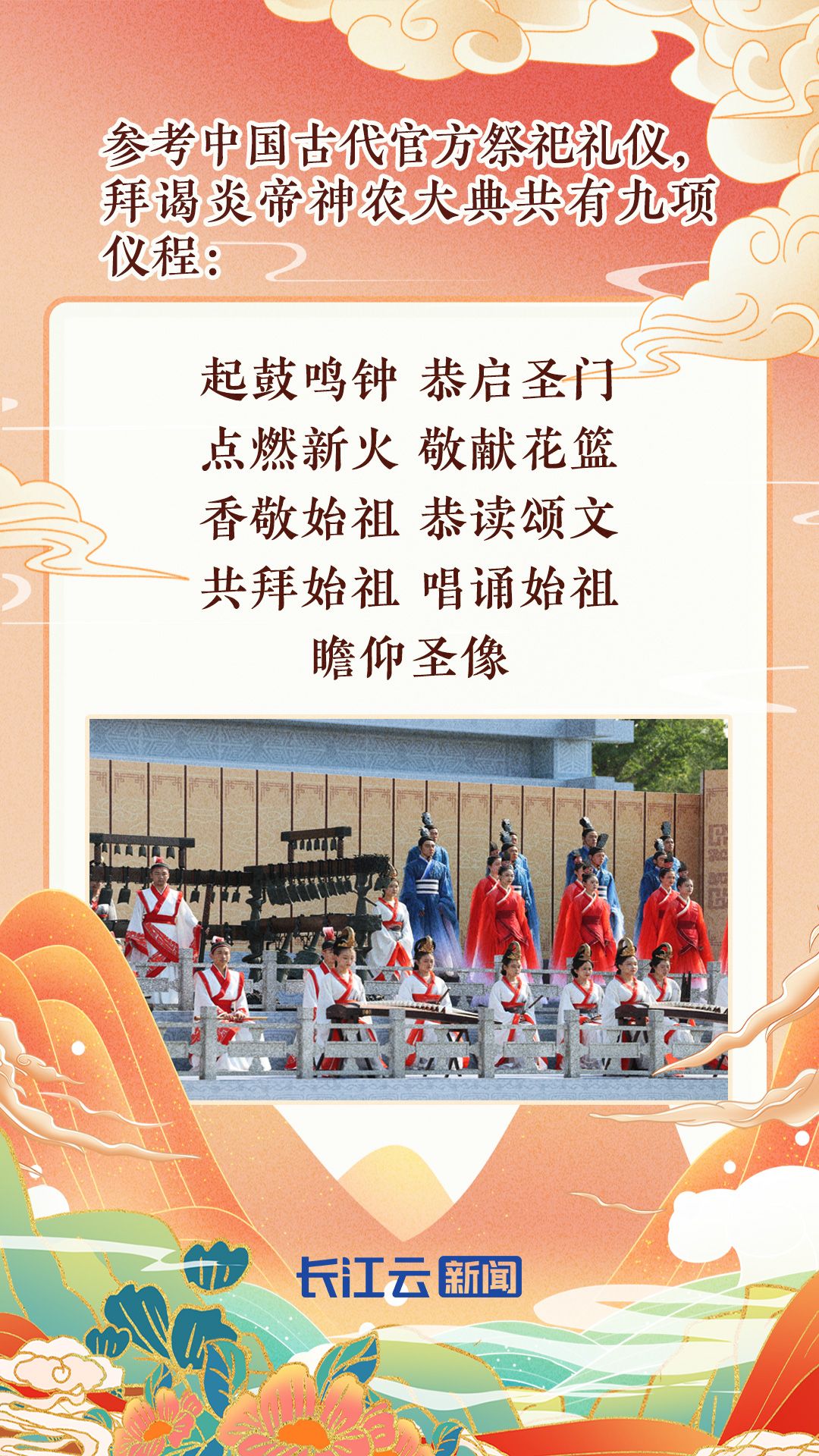 在仪式流程方面,设计有:起鼓鸣钟、恭启圣门、点燃新火、敬献花篮、香敬始祖、恭读颂文、共拜始祖、唱诵始祖、瞻仰圣像等九项仪程,充分融入了炎帝文化、荆楚文化、曾随文化的元素;