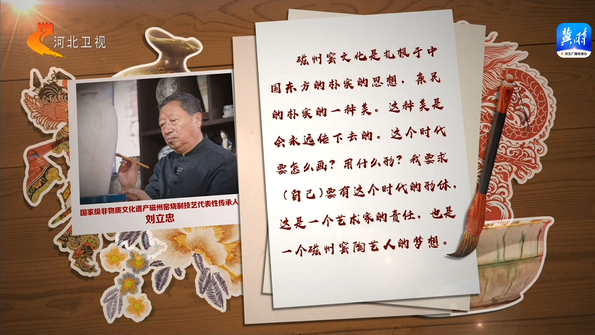 磁州窑文化是扎根于中国东方的朴实的思想,亲民的朴实的一种美,这种美是会永远传下去的。这个时代要怎么画?用什么形?我要求(自己)要有这个时代的形体,这是一个艺术家的责任,也是一个磁州窑陶艺人的梦想。