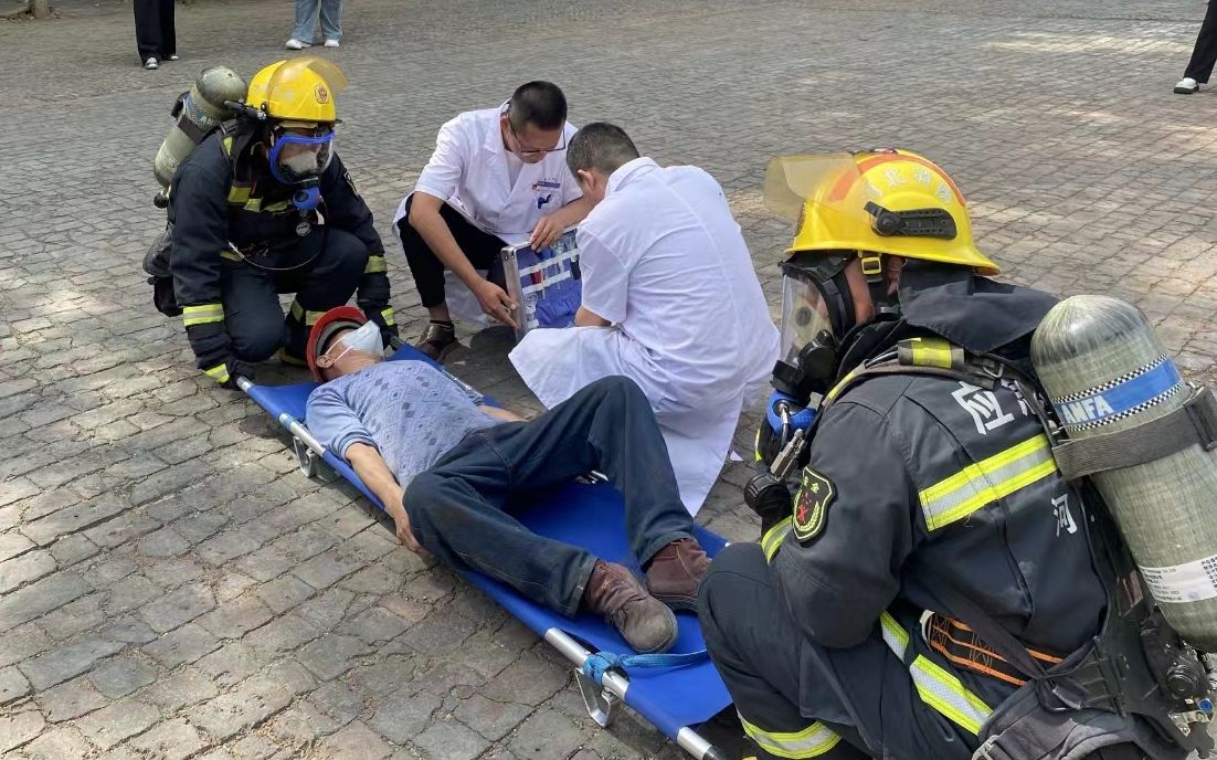 在火情演练中,假定生产车间某处起火,车间内员工立即按照各自分工,在发现火灾、发出预警、人员疏散到防火装备穿戴、迅速使用消火栓、灭火器前期火灾扑救等各环节演练。建国镇消防站、各乡镇医院人员分别实施灭火和人员救治,演练达到了预期效果。