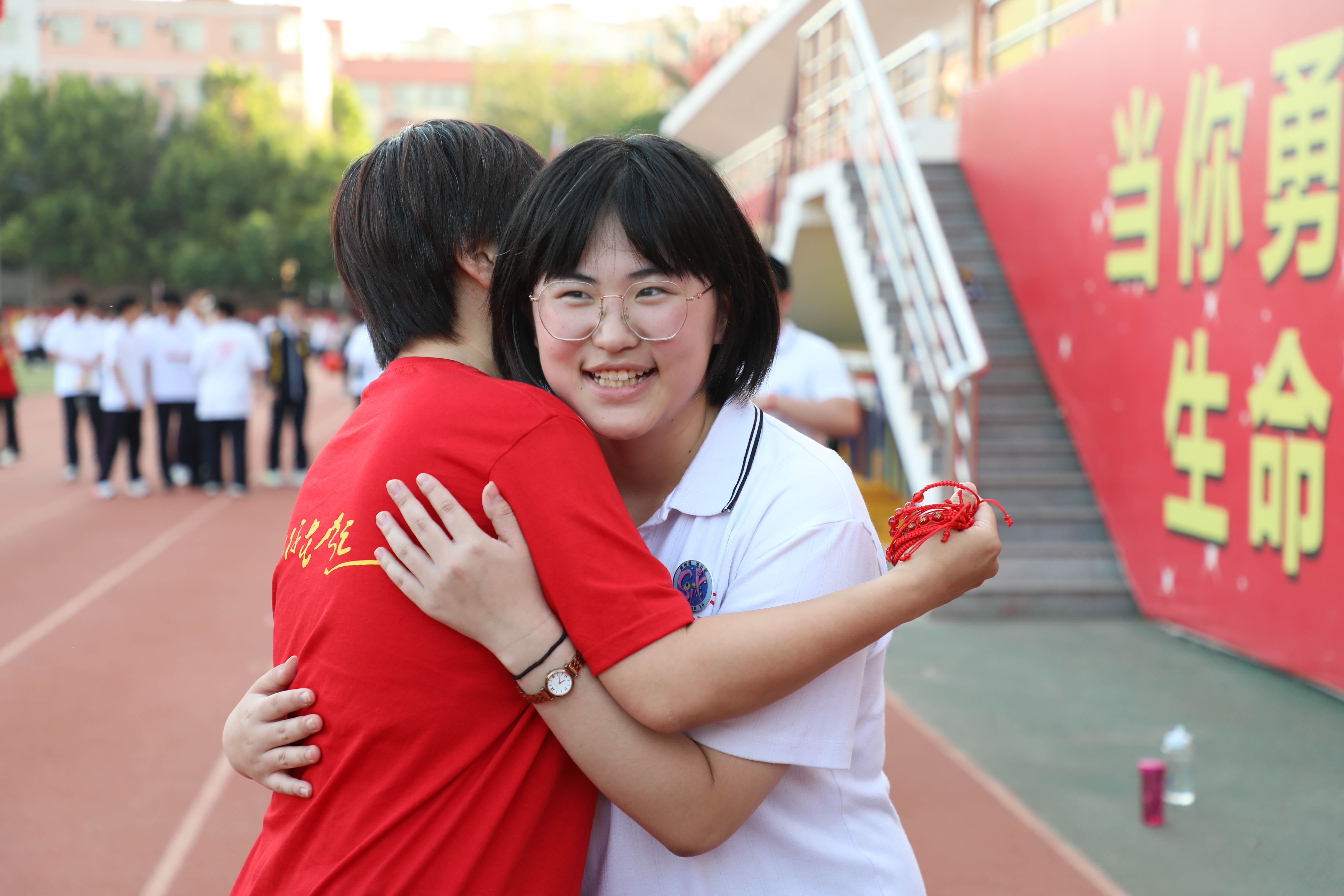 老师与学生拥抱,为学生鼓劲儿加油。