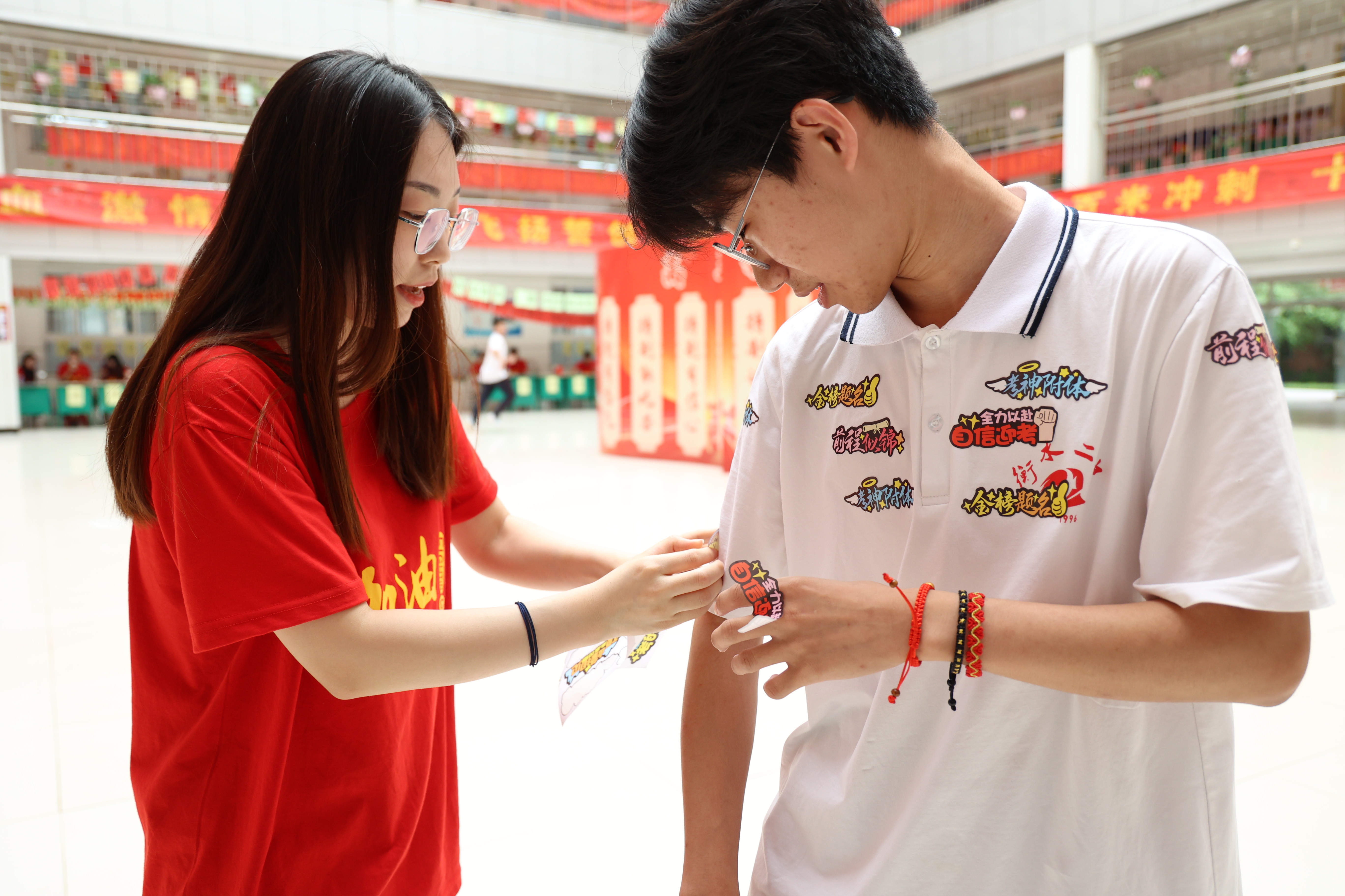 老师亲手为学生贴上励志标签。