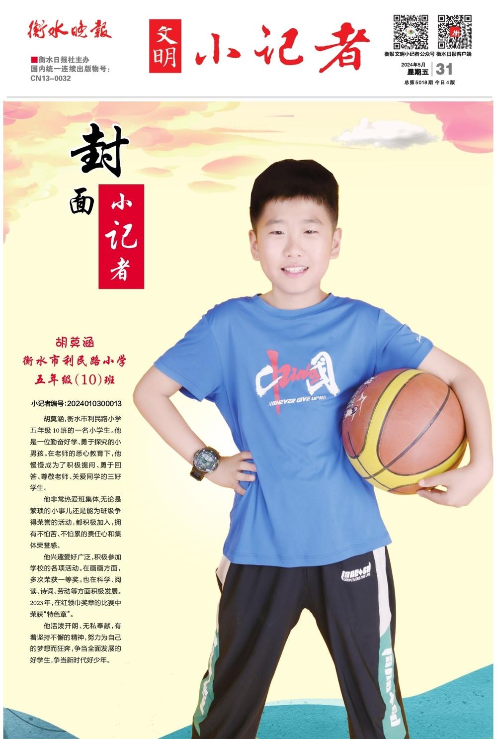 胡莫涵,衡水市利民路小学五年级10班的一名小学生。他是一位勤奋好学、勇于探究的小男孩。在老师的悉心教育下,他慢慢成为了积极提问、勇于回答、尊敬老师、关爱同学的三好学生。