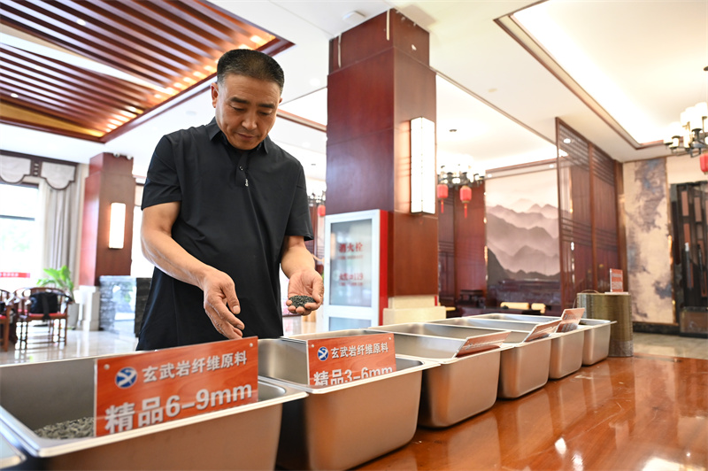 6月5日,在蔚县新源玄武岩矿业有限公司办公楼一楼大厅,公司负责人朱兆春展示玄武岩纤维原料。 河北日报记者 郭晓通摄