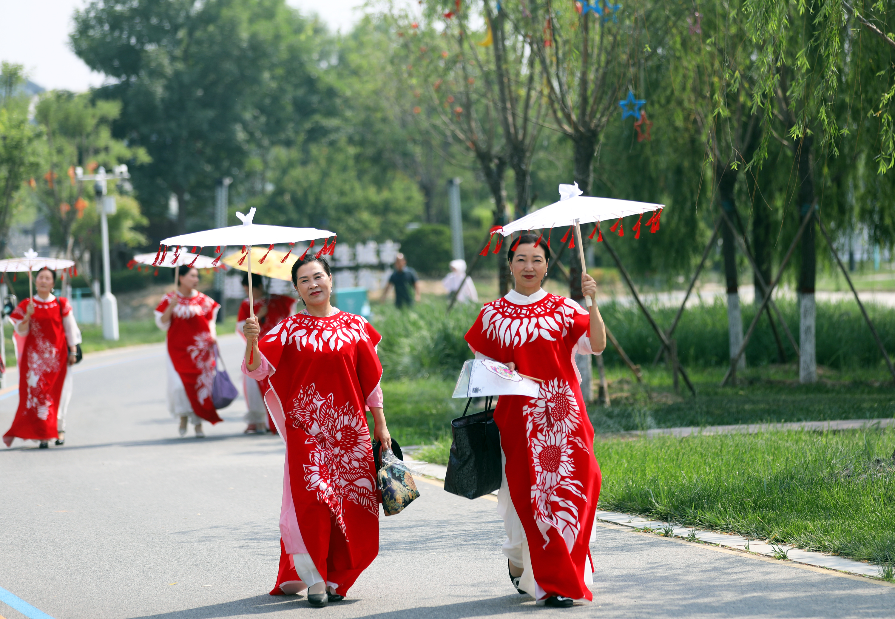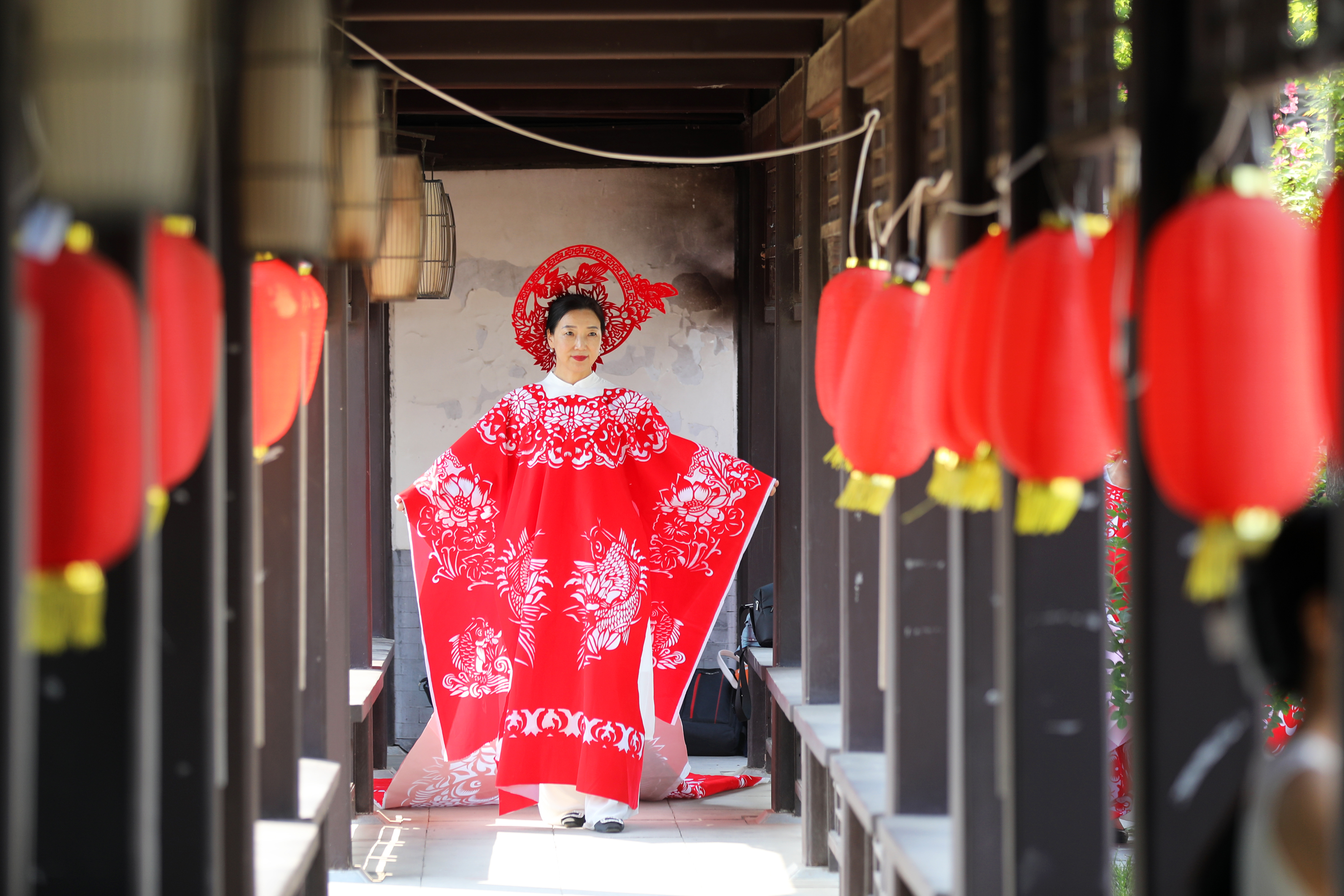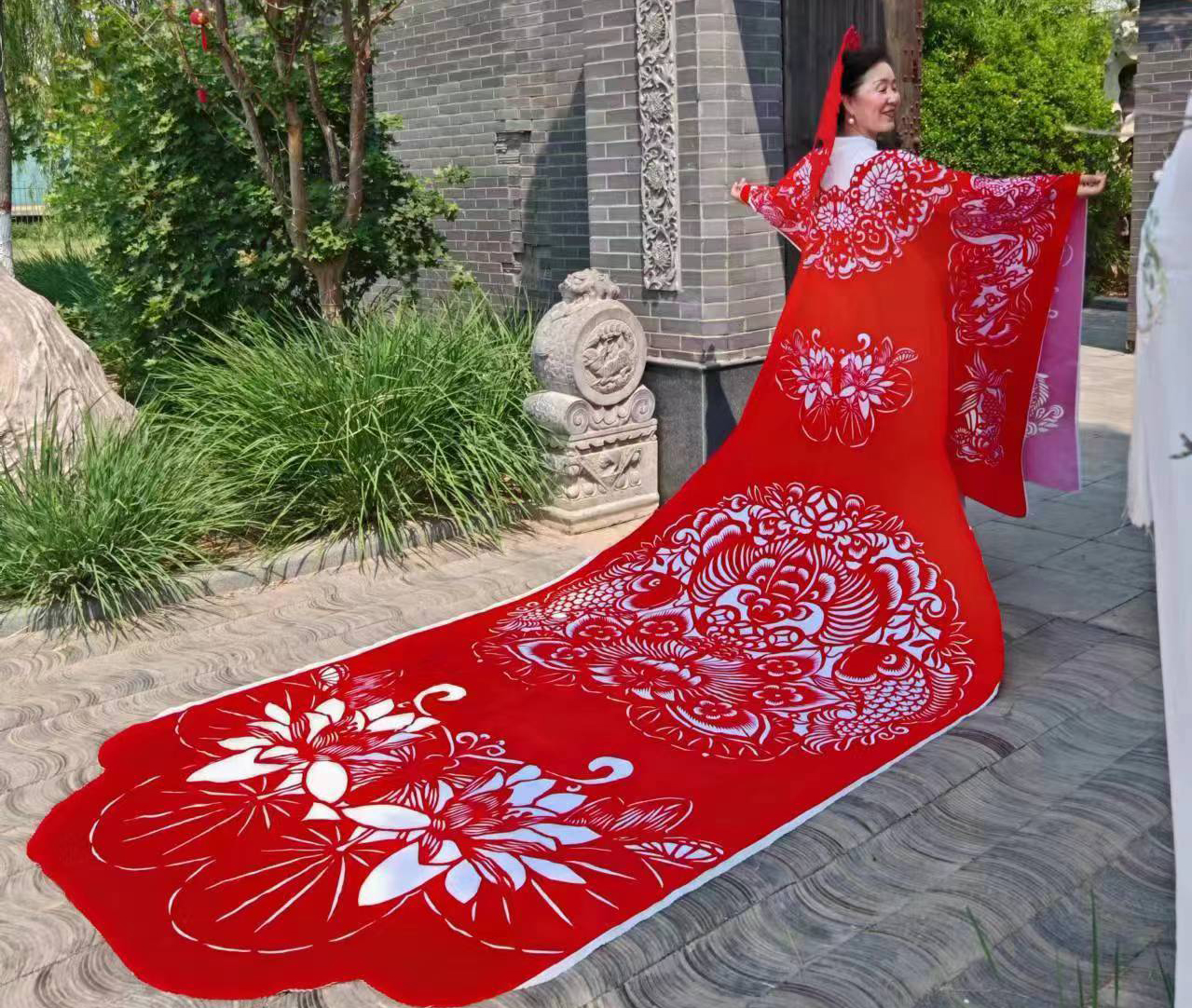 6月6日,在园博园内,一路通关、旗开得胜、一举夺魁……祝福高考寓意的红色剪纸服饰惊艳亮相,5名模特披着中国红镂空图案剪纸服装,在优美的环境中款款走秀,吸引了游客,“真漂亮”“非常美”游客们纷纷赞美道。