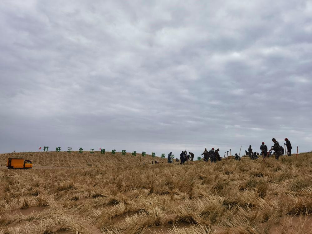 甘肃民勤县的西大河小井子区域,草网格状双眉式沙障、稻草集束直立式沙障、尼龙网沙障等,间隔多行交错排列。研究员们逐一测量沙障宽度、高度后,按当地水资源等条件,栽下梭梭、毛条、沙拐枣等树种……