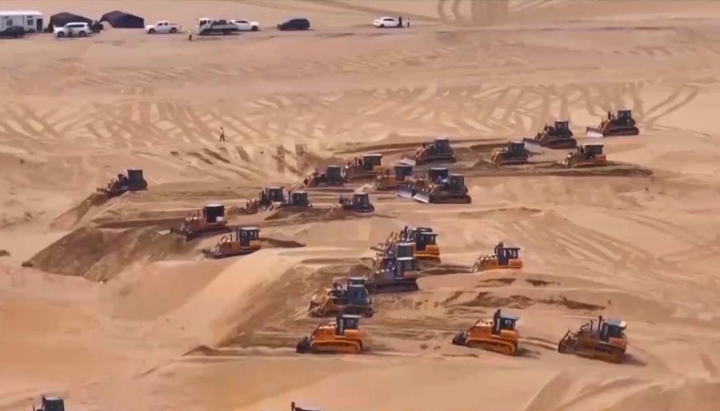 在内蒙古鄂尔多斯的茫茫沙海中,近200台推土机来回穿行,推平高低起伏、连绵不断的沙丘,以便后续在此安装光伏板。这正是当下最新的光伏治沙模式中的一个环节。