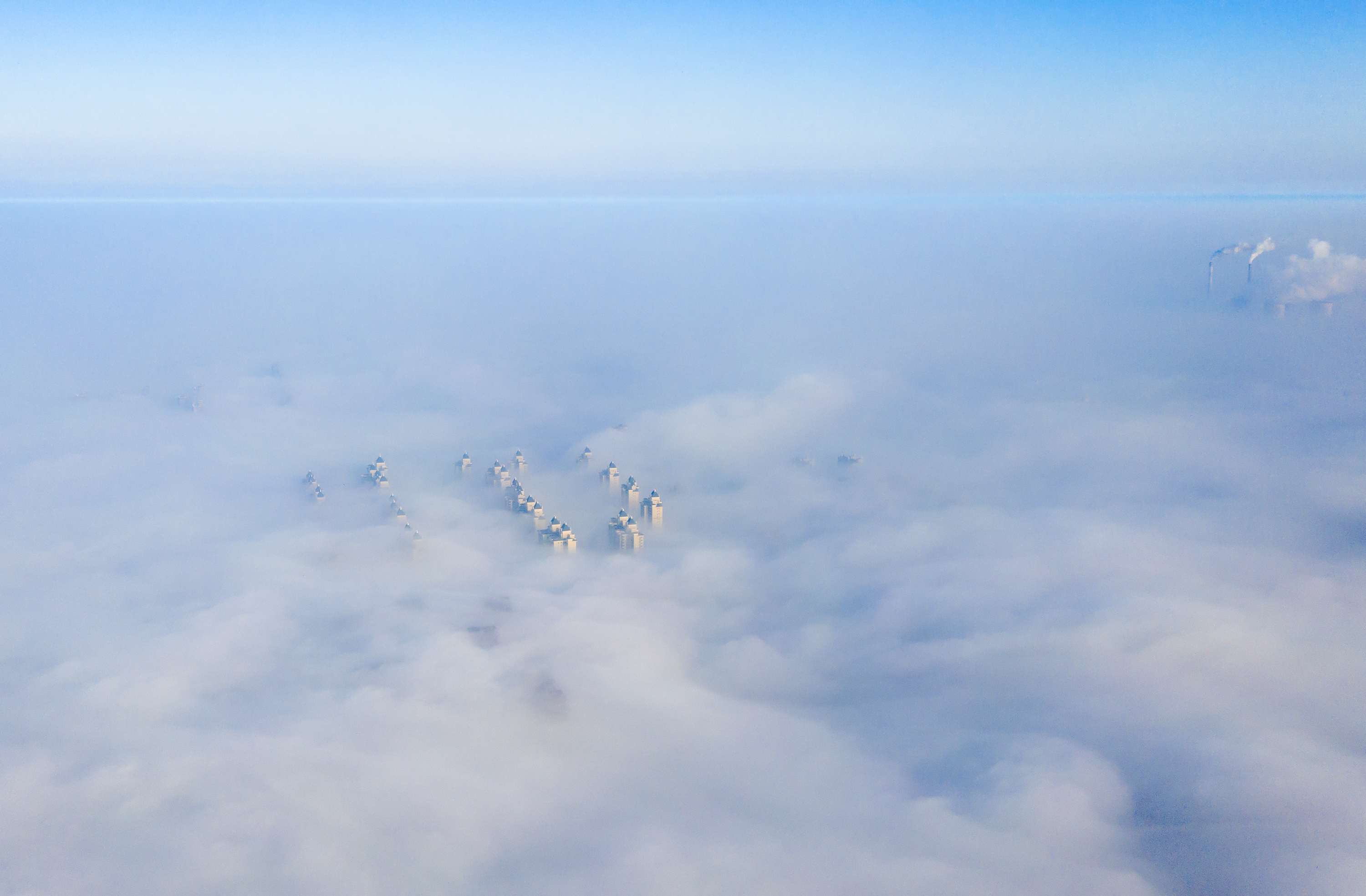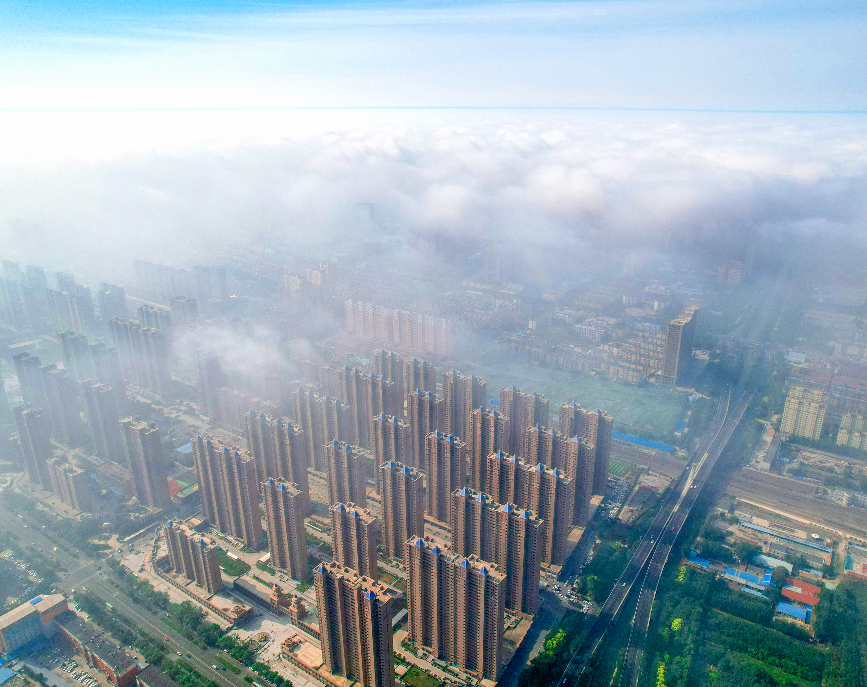 6月8日,衡水市区出现平流雾景观。通过无人机鸟瞰,城市建筑置身平流雾中,仿佛“海市蜃楼”,如梦如幻。