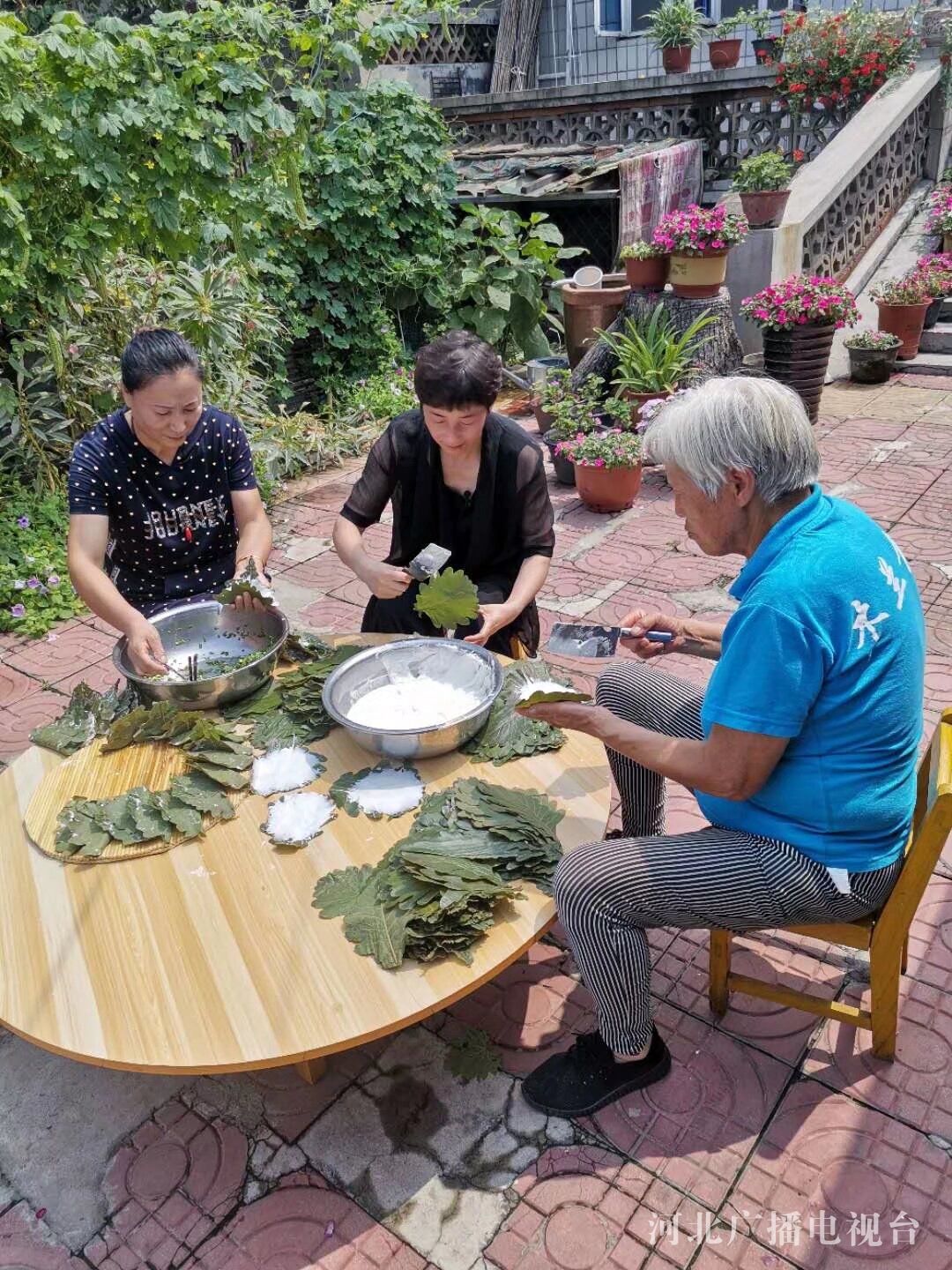 在秦皇岛市海港区石门寨镇长城沿线连绵的群山之中,桲椤叶树处处可见,树上的叶子宽厚柔韧,香味浓郁,长势喜人。一大早,秦皇岛市级非物质文化遗产项目桲椤叶饼制作技艺的代表性传承人杨桂云,就和姐妹们一起进山采摘新鲜的桲椤叶了。杨桂云说,桲椤叶是橡树叶的一种,也叫斛叶。端午节采摘叶子正应时,我们家家户户都会到山上采摘这种桲椤叶,这个季节叶子的清香味道正浓郁,适合做桲椤叶饼,采早了会有点儿嫩,过了这个季节,叶子就长老了。