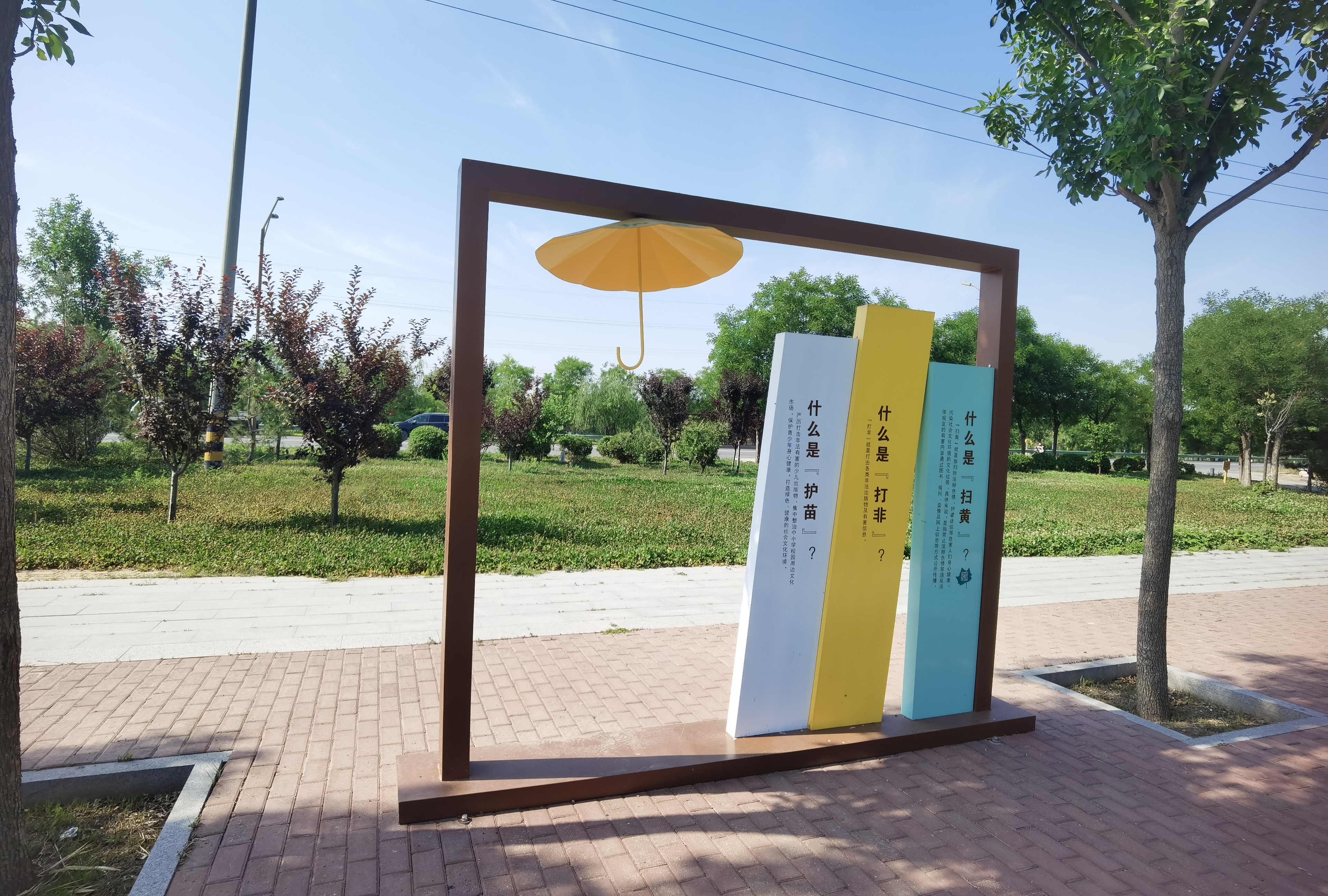 桃城区赵家圈镇前铺村“扫黄打非”主题公园位于村口西南角,占地约7亩。初看公园外观,似乎与普通的农村小公园并无二致,以绿地、树木、甬道等景观为主。但漫步其中,记者却很快“品”到了一股独特的法治宣传韵味。原来,这里通过设置主题地标牌、宣传展板等形式,因地制宜地打造了3座“扫黄打非”主题景观小品,巧妙地分布在公园各处,既与周围自然景致融为一体,又各具特色,吸睛的同时,也立体化地宣传了“扫黄打非”的知识。