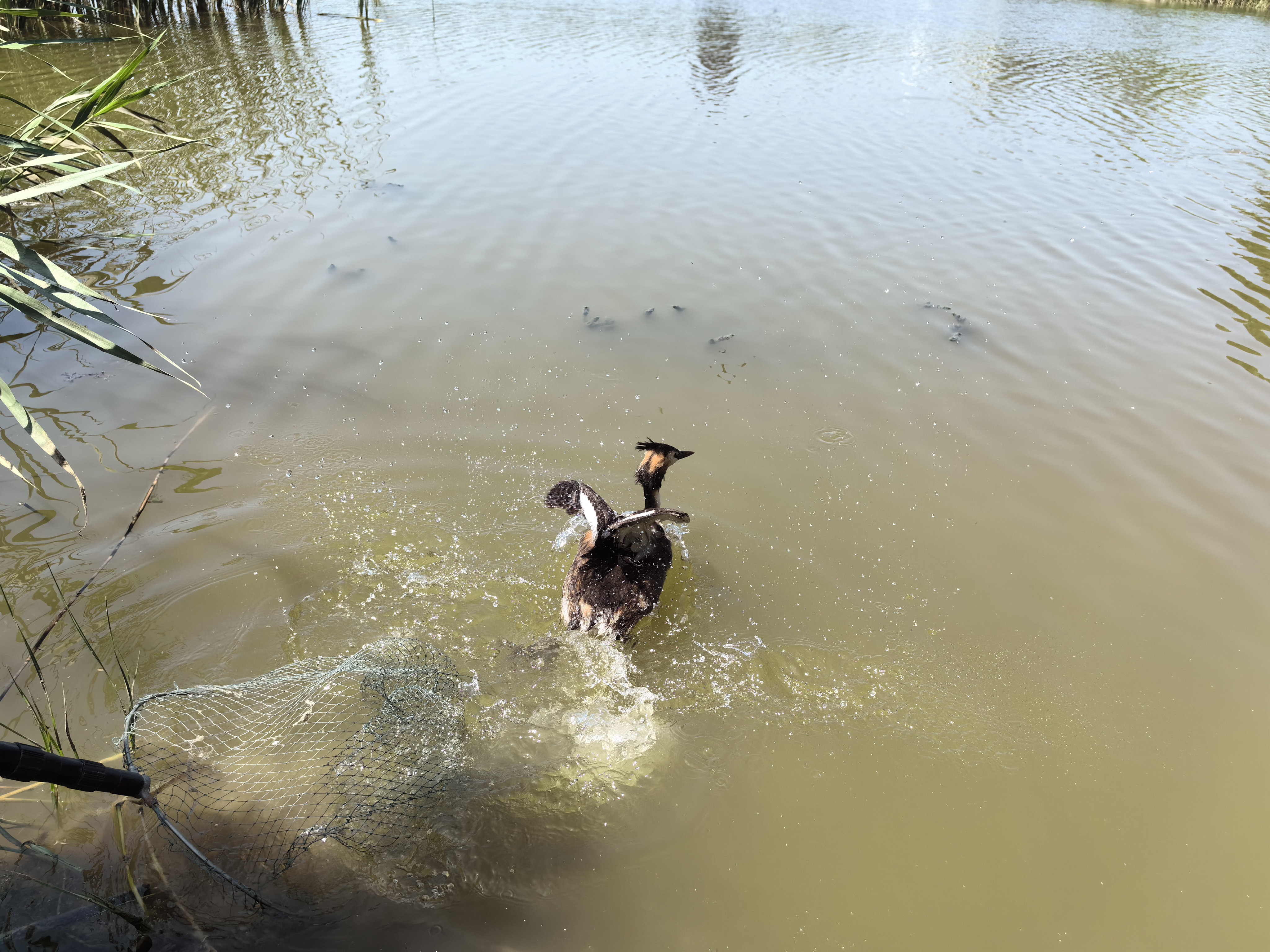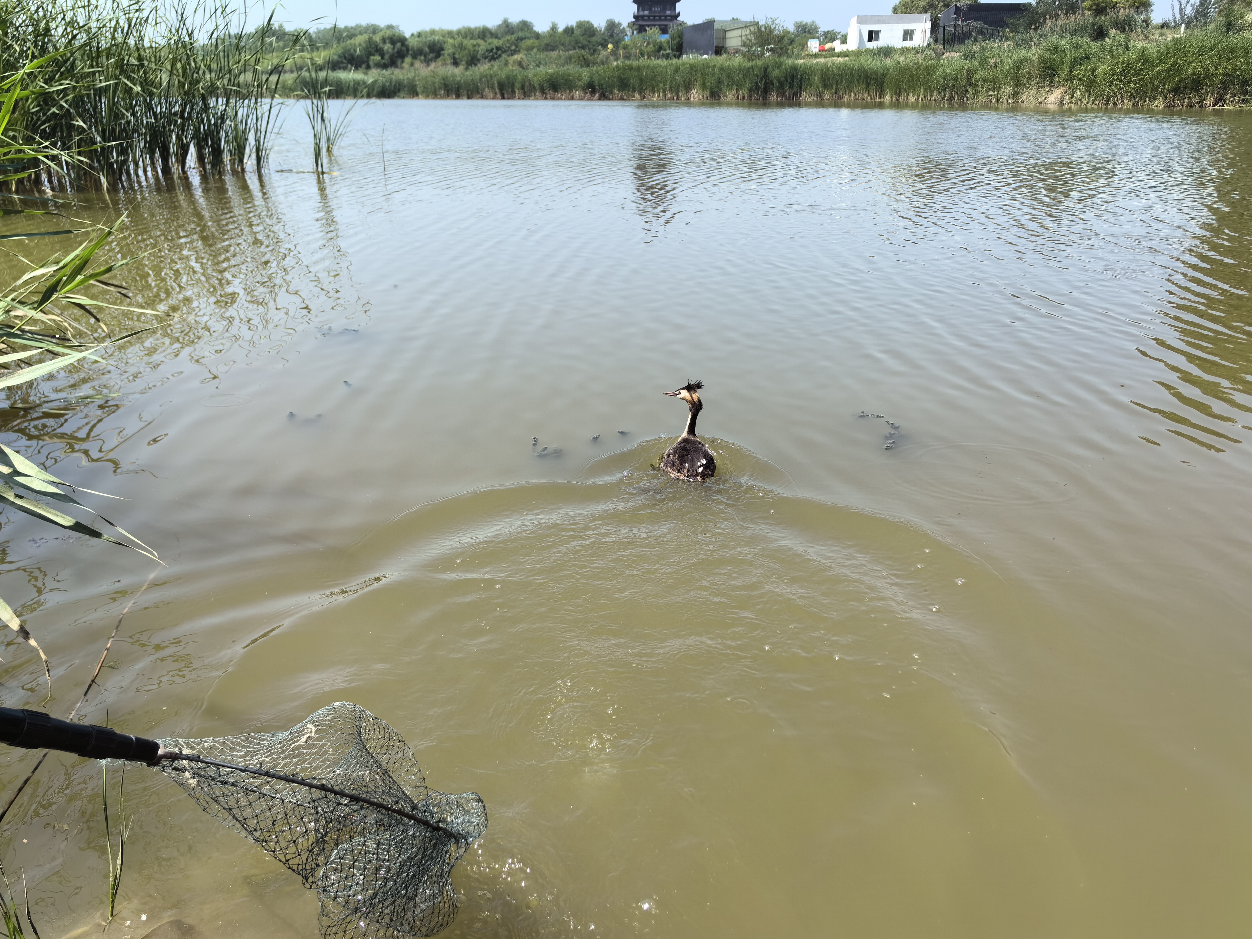 王先生和摄影爱好者观察发现,这只凤头鸊鷉只是身体较为虚弱,其他并无大碍,符合放生条件。于是,两人合力用网抓住大鸟,并将其带至老盐河边放生。