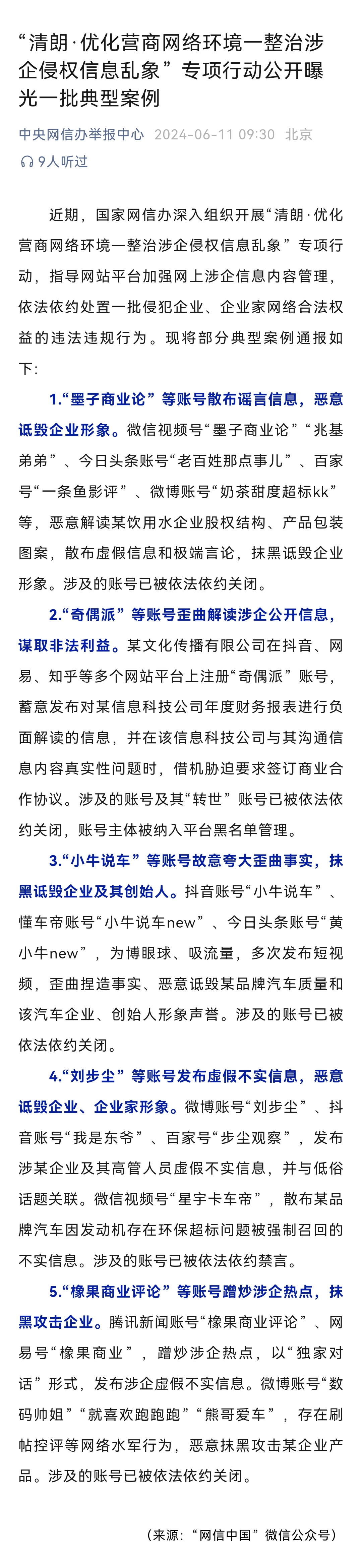 “清朗·优化营商网络环境一整治涉企侵权信息乱象”专项行动公开曝光一批典型案例