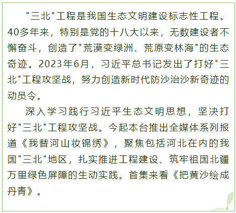 从燕赵大地放眼祖国北疆,从"沙进人退"到"绿进沙退"的历史性转变已经实现。