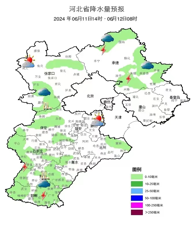 具体天气预报为:6月11日傍晚到夜间,阴有分散性雷阵雨或阵雨转晴,偏南风3~4级,最低气温24~25℃;6月12日,晴间多云,偏南风3~4级,气温41~26℃;6月13日,晴转多云,偏南风4级左右,气温42~30℃;6月14日,多云间阴有雷阵雨,东北风3~4级,阵风5~6级,气温35~23℃;6月15日,多云转晴,气温35~23℃。
