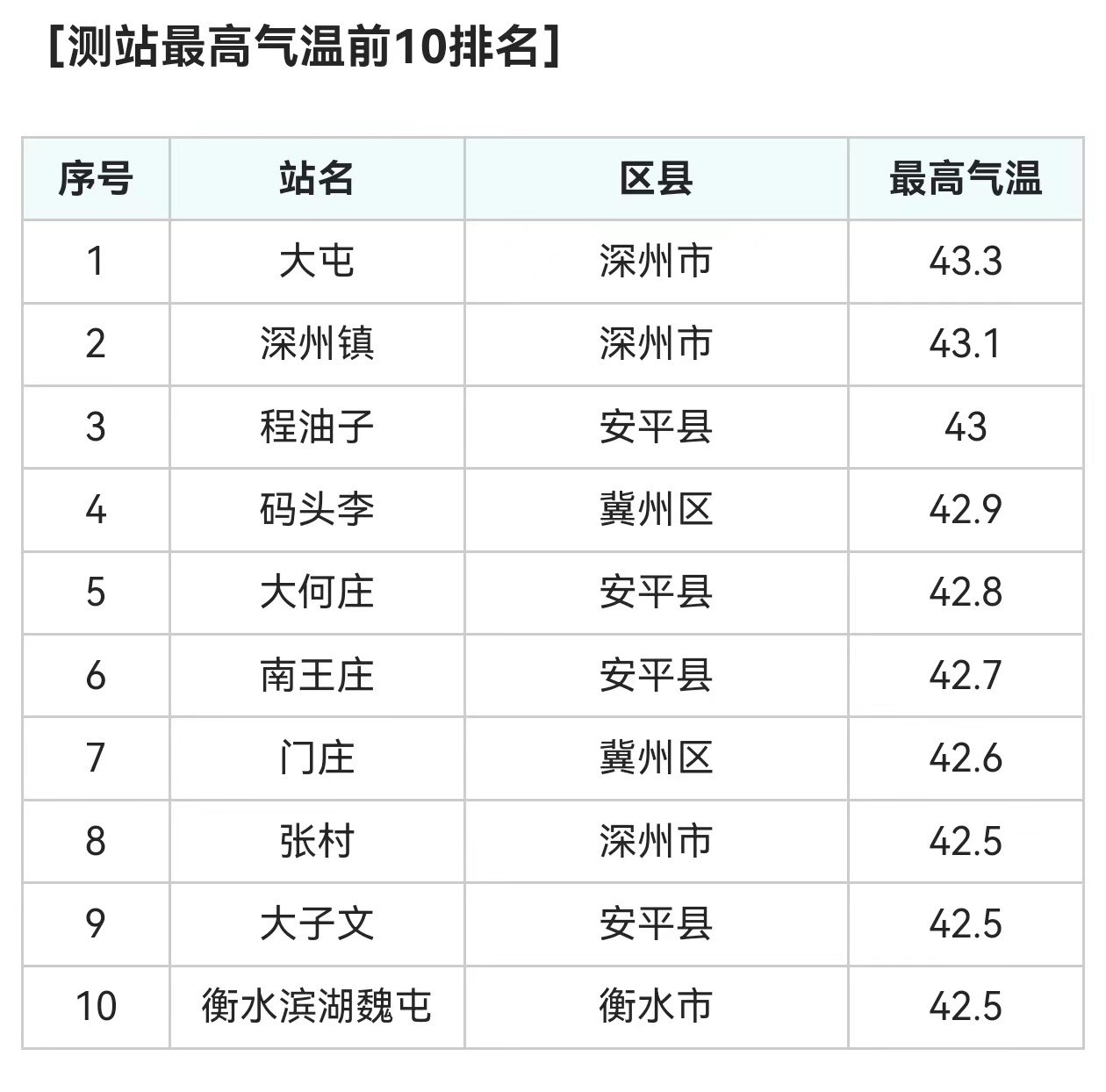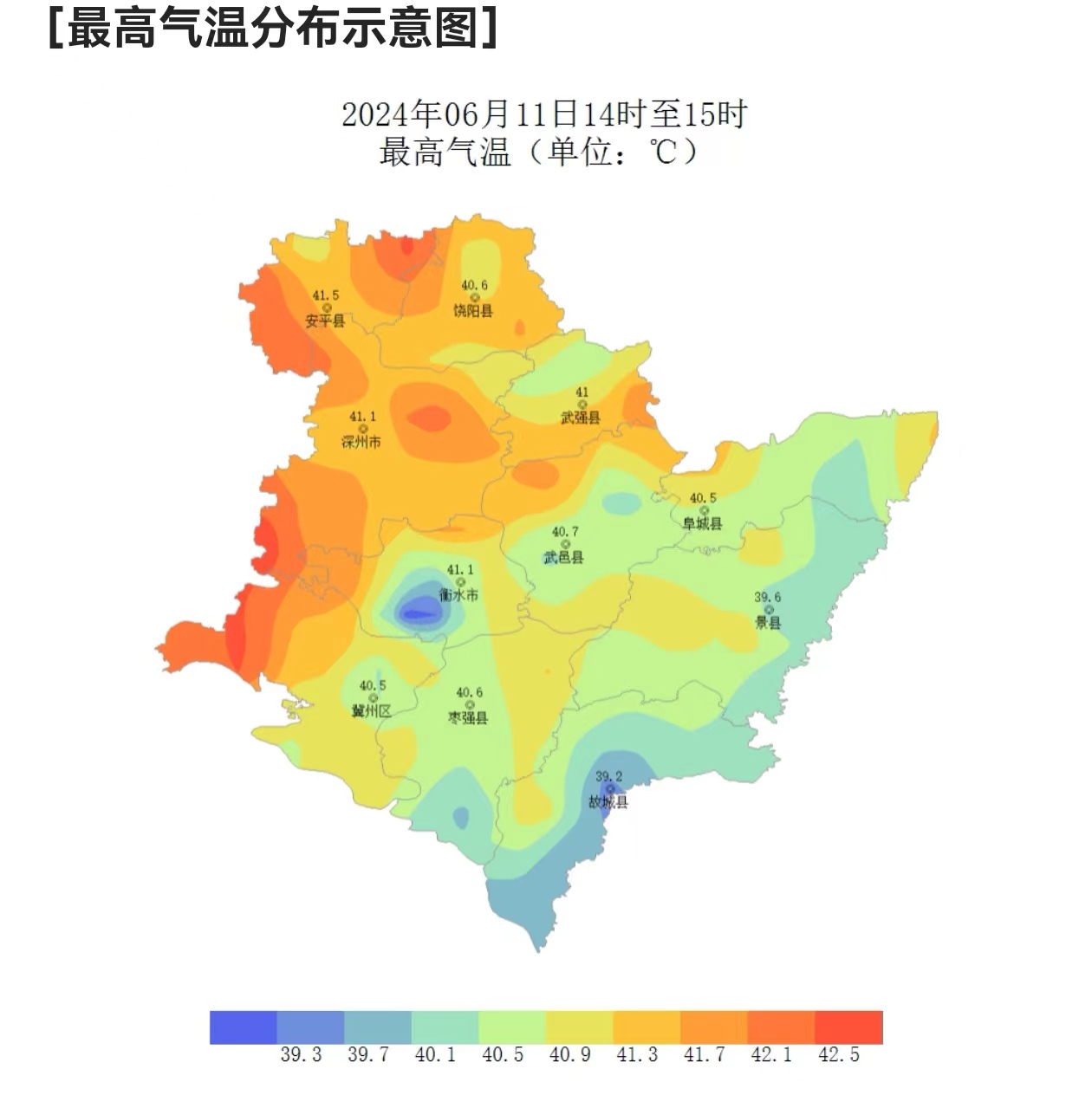 未来几天高温持续发展,衡水市气象台6月11日15时16分发布高温红色预警信号,预计11日下午到12日白天,衡水市全部县(市、区)最高气温可达40℃以上。全市大部地区中暑气象风险等级为Ⅰ级,极易发生中暑。而到了13日更是将冲刺本次高温过程的峰值,大家要做好防暑降温“持久战”的准备。