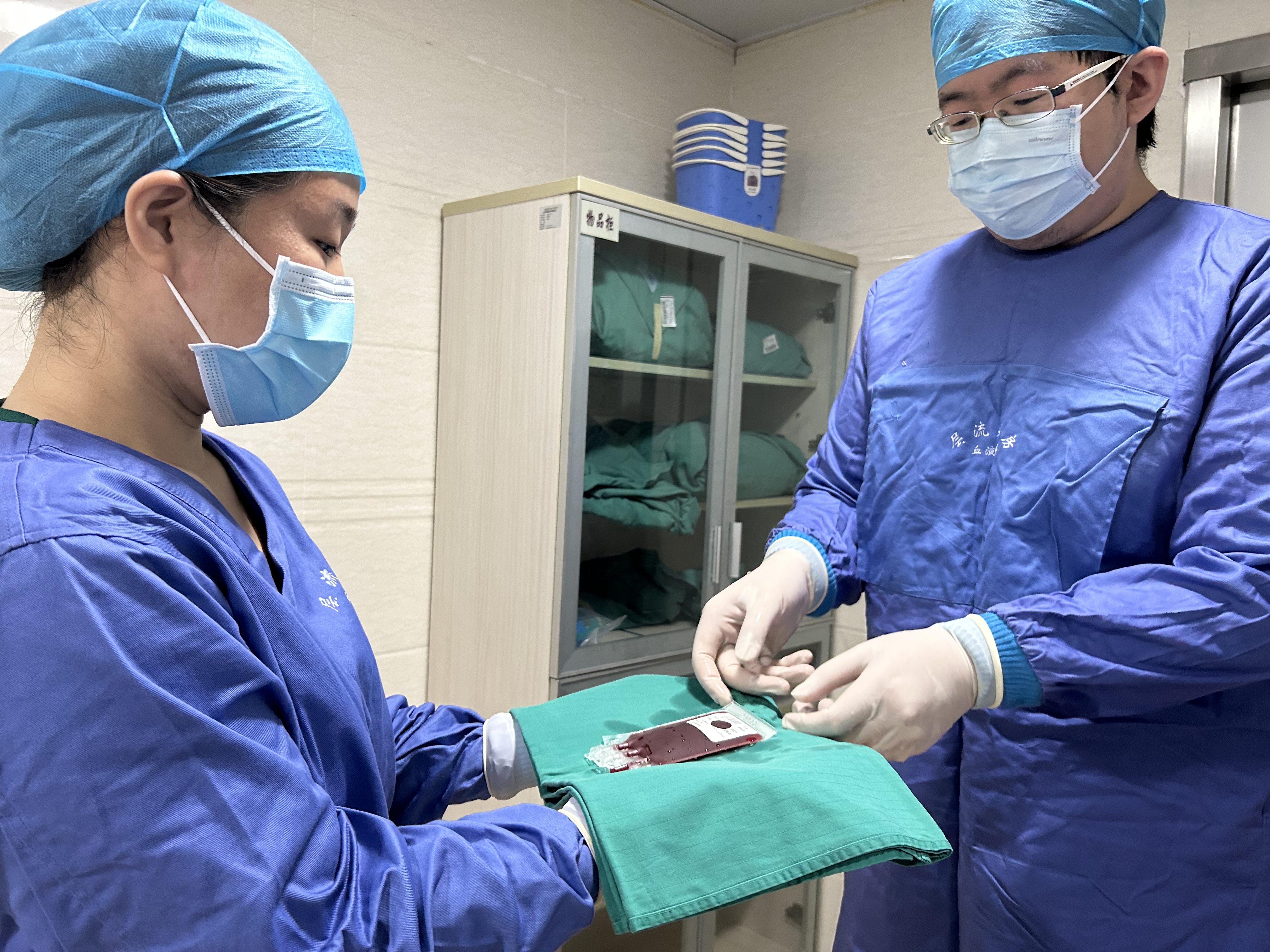 工作人员在向仓内传送复温后的造血干细胞。