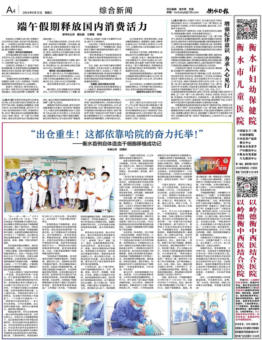 “出——仓——啦——”6月3日,14岁男孩小华(化名)自体造血干细胞移植术后顺利出仓,标志着衡水首例自体造血干细胞移植宣告成功,填补了我市空白,同时也标志着衡水市人民医院(哈励逊国际和平医院)血液恶性肿瘤疾病的诊治水平再上了一个新台阶。这让衡水及周边血液病患者在“家门口”即可享受优质、高效、便捷、同质化的医疗服务。