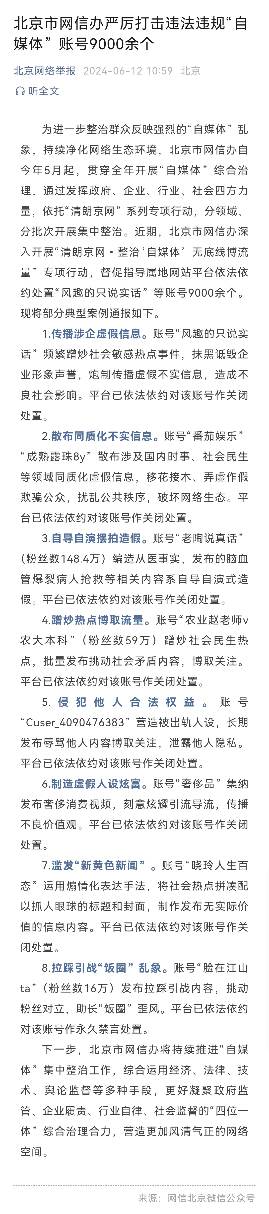 详情:近期,北京市网信办深入开展“清朗京网•整治‘自媒体’无底线博流量”专项行动,督促指导属地网站平台依法依约处置“风趣的只说实话”等账号9000余个。现将部分典型案例通报如下。