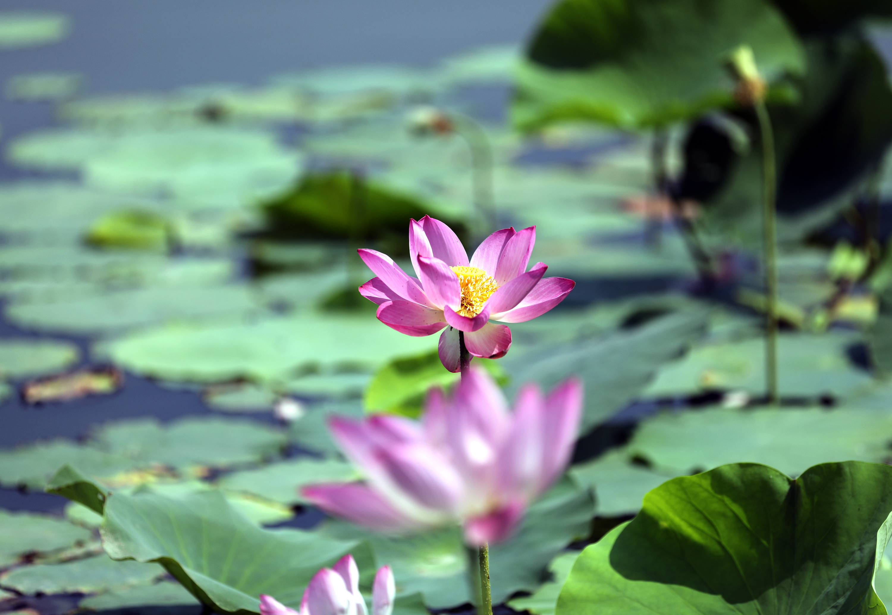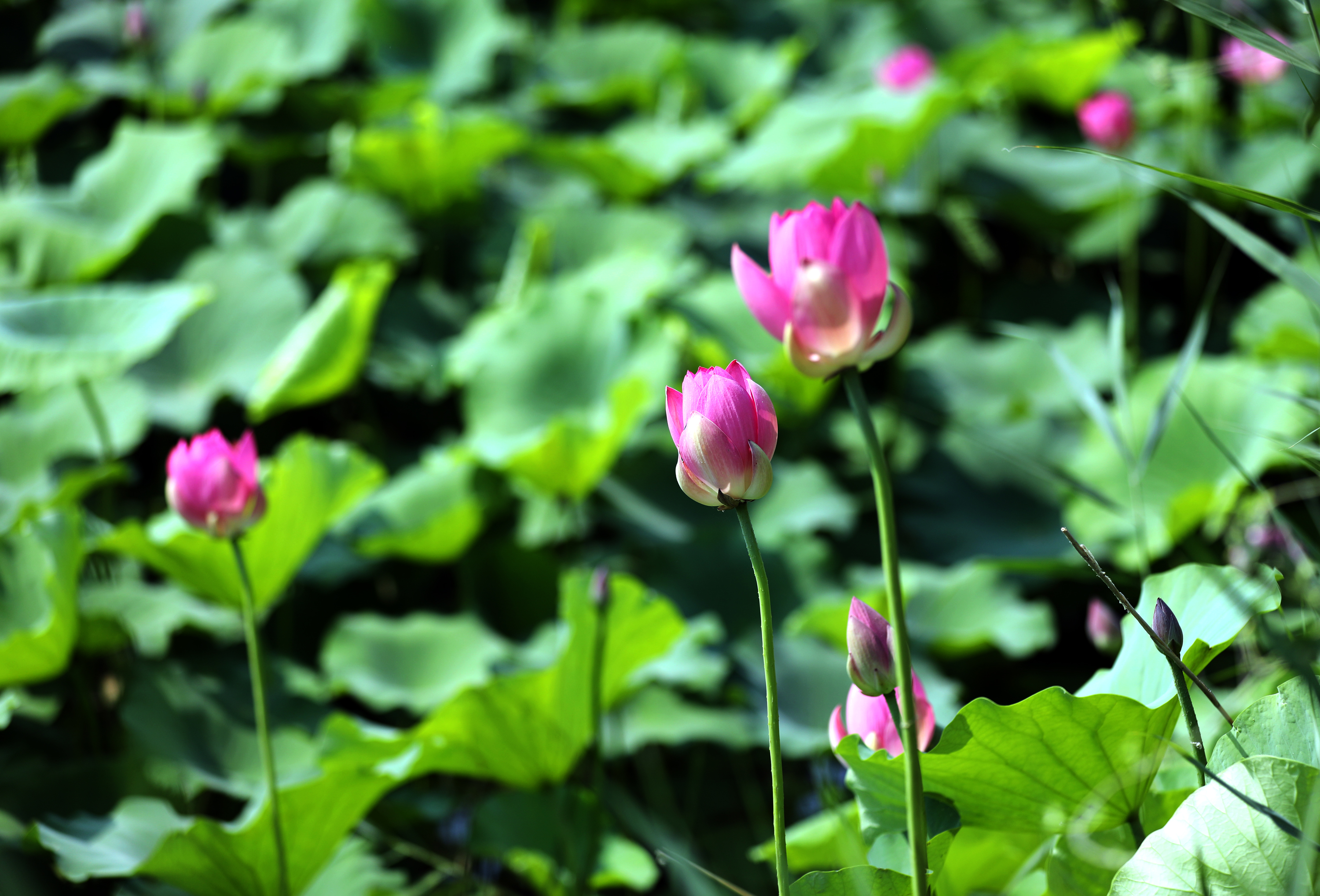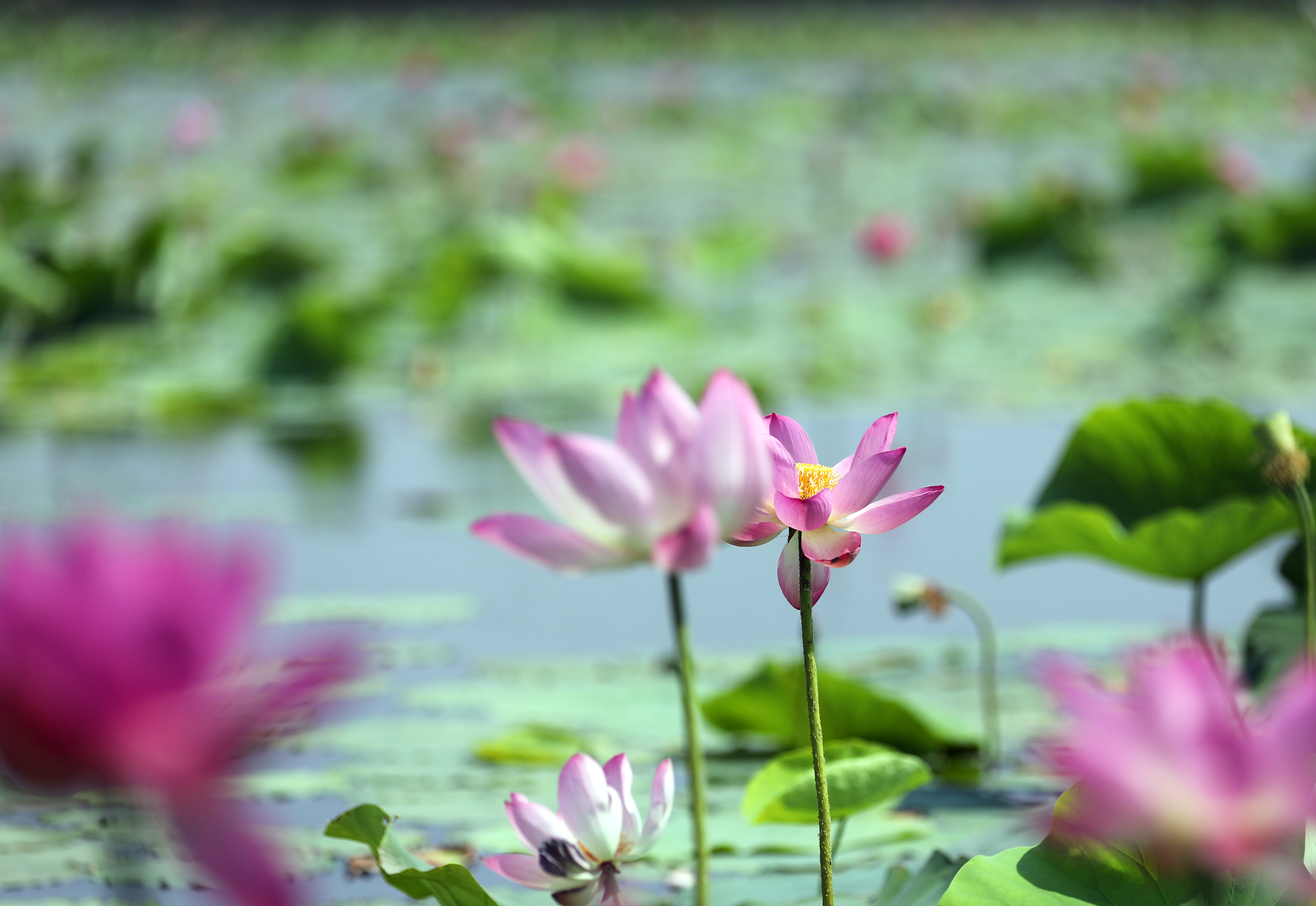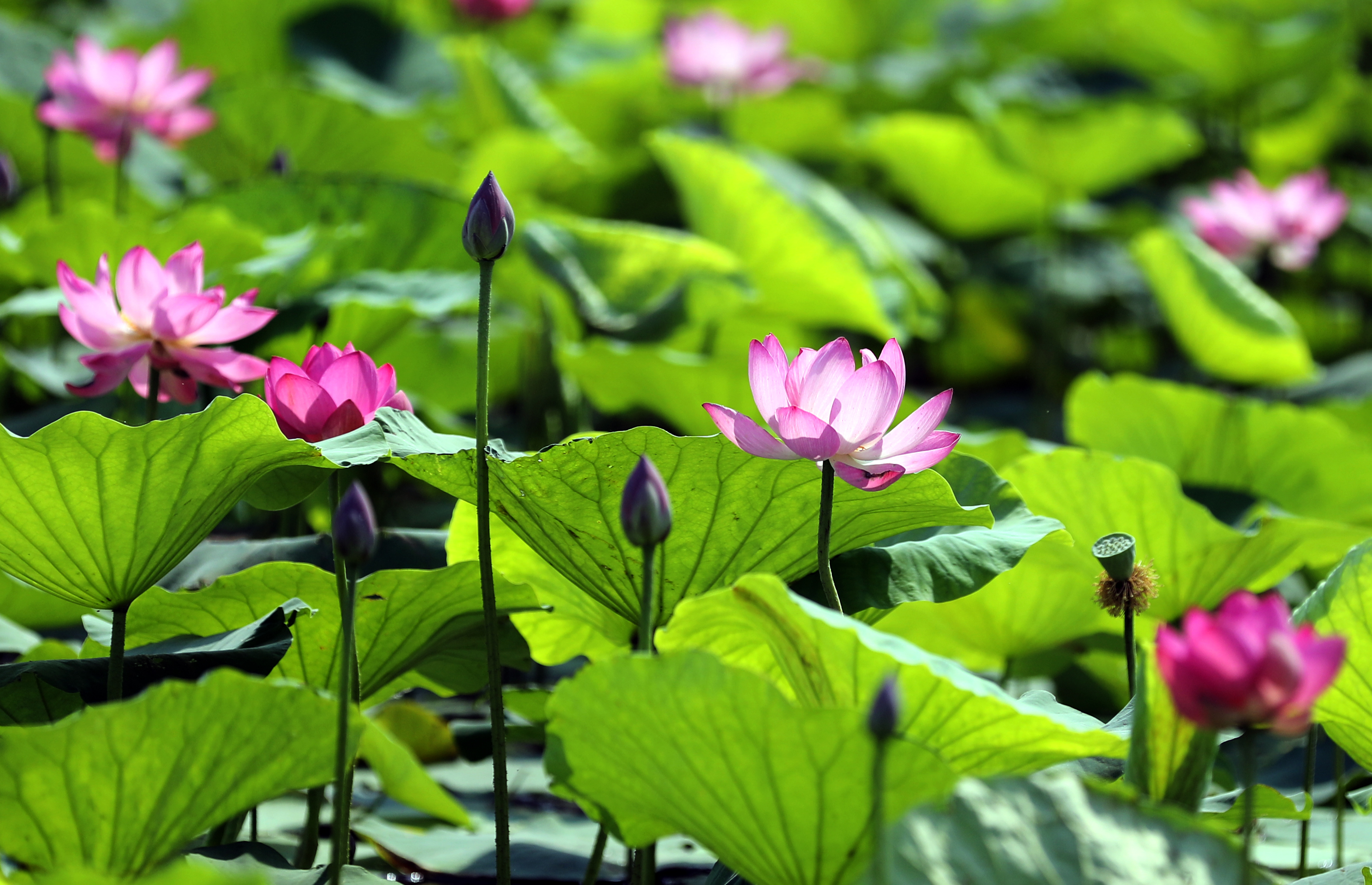 6月14日,在衡水湖畔的荷花池里,朵朵荷花亭亭玉立,它们有的含苞待放,有的初露芳容,有的全然盛开,每一朵都以不同的风姿展现着夏日的生机与活力;花瓣层层叠叠,或白如雪,或粉如霞,美不胜收;花蕊金黄璀璨,点缀着花瓣,使其更显高贵与典雅。