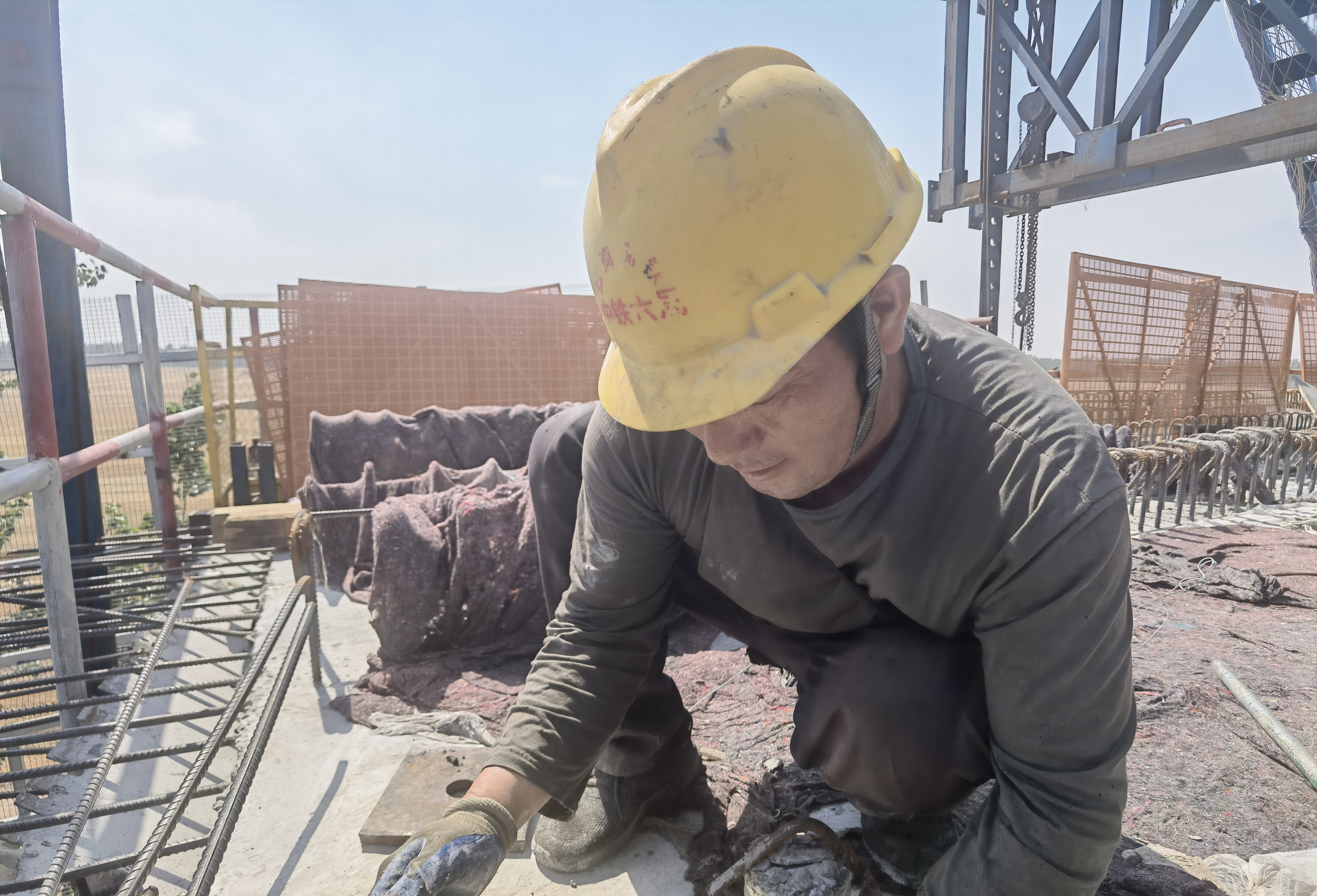 16日,在位于深州市护驾迟镇的雄商高铁燕河连续梁施工现场,工人正在紧锣密鼓地施工。暴露在阳光下的钢筋和钢模板表面温度高达50多度,为了不被烫伤,工人们用长袖长裤和厚实的手套,将自己包裹得严严实实。“钢模板最热的地方能煎鸡蛋。”项目部一工区支部书记马力峰介绍,“一天下来,衣服上都结出盐霜,工人们都笑着说自己的主业是施工,副业是晒盐。”