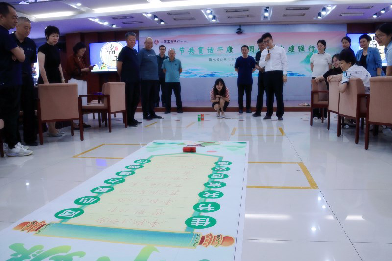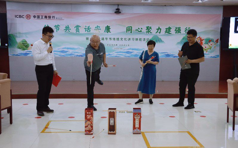 活动中,参与者现场抽签分为A、B、C、D四个队,采取“文武闯关”形式进行PK赛。“文关”以知识问答方式进行,主要围绕端午节传统文化、工行企业文化、衡水历史文化等内容;“武关”围绕端午节主题进行“投壶”“滚滚乐”“合力建塔”“有规有矩”等运动项目进行体验和竞赛,“文关”和“武关”交叉进行。活动还准备了粽子等小吃,让大家即品尝了美食,又享受了活动带来的快乐。现场气氛喜庆欢快,笑声不断,掌声阵阵,所有人都沉浸在节日的欢乐中。
