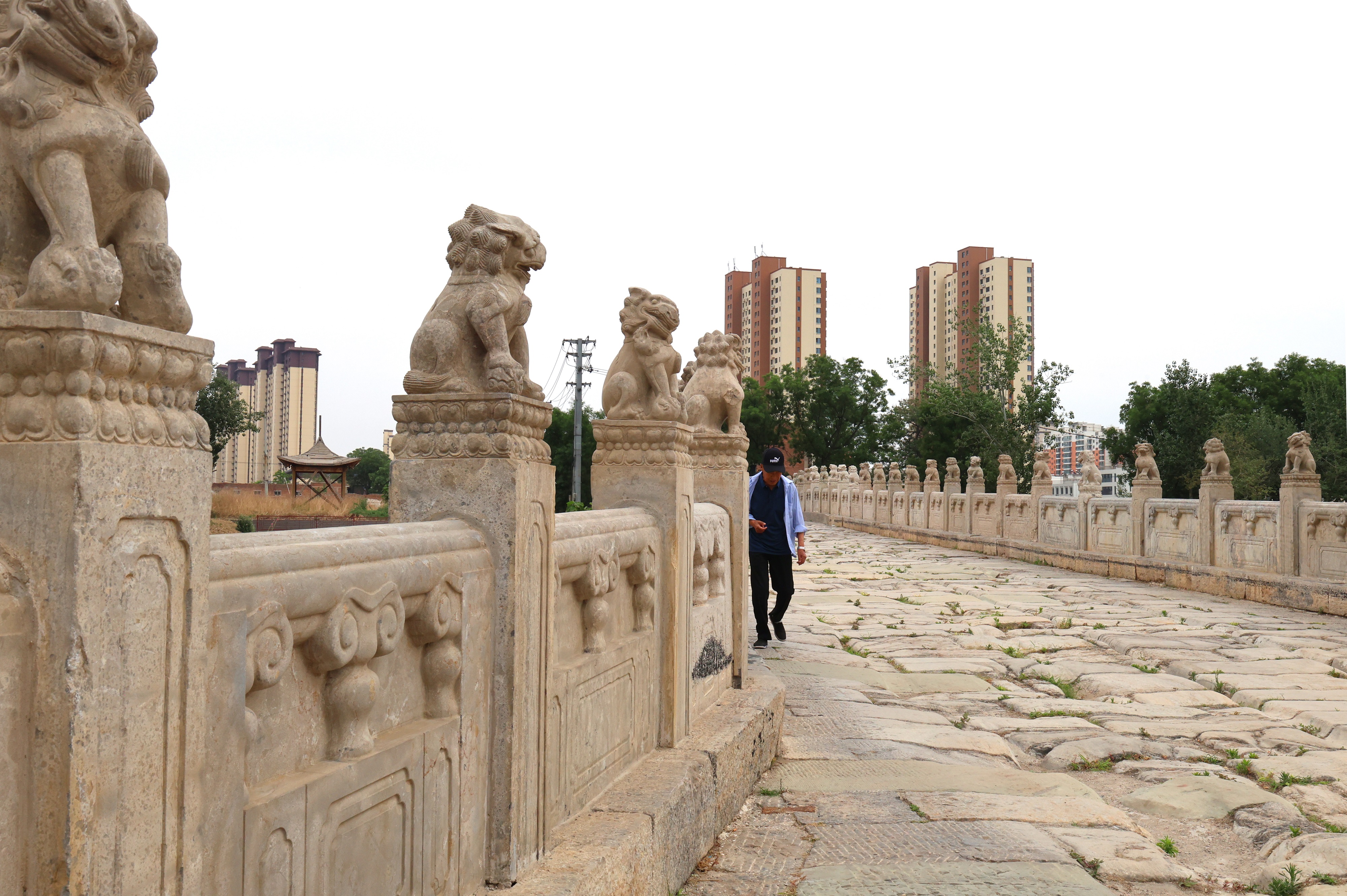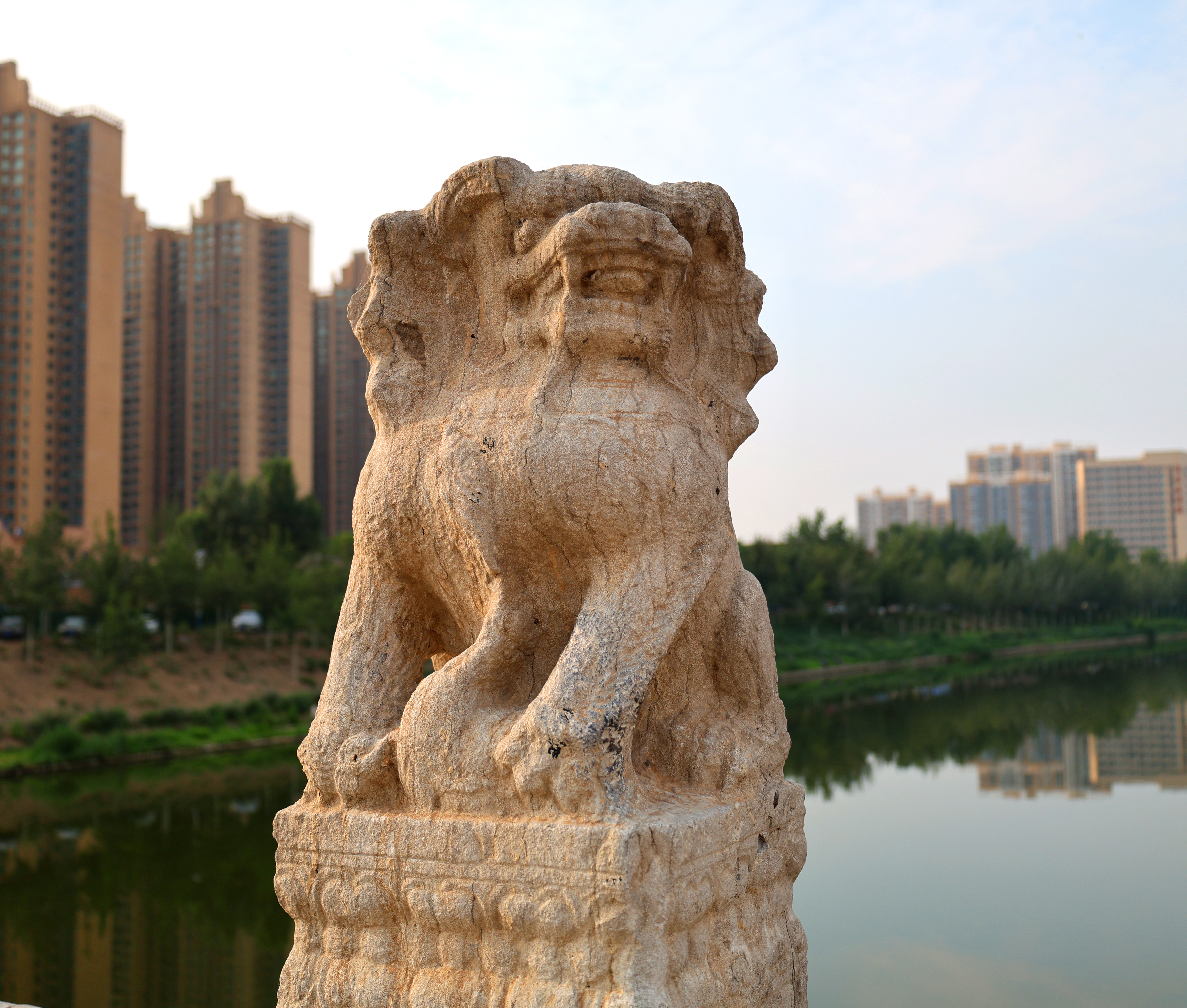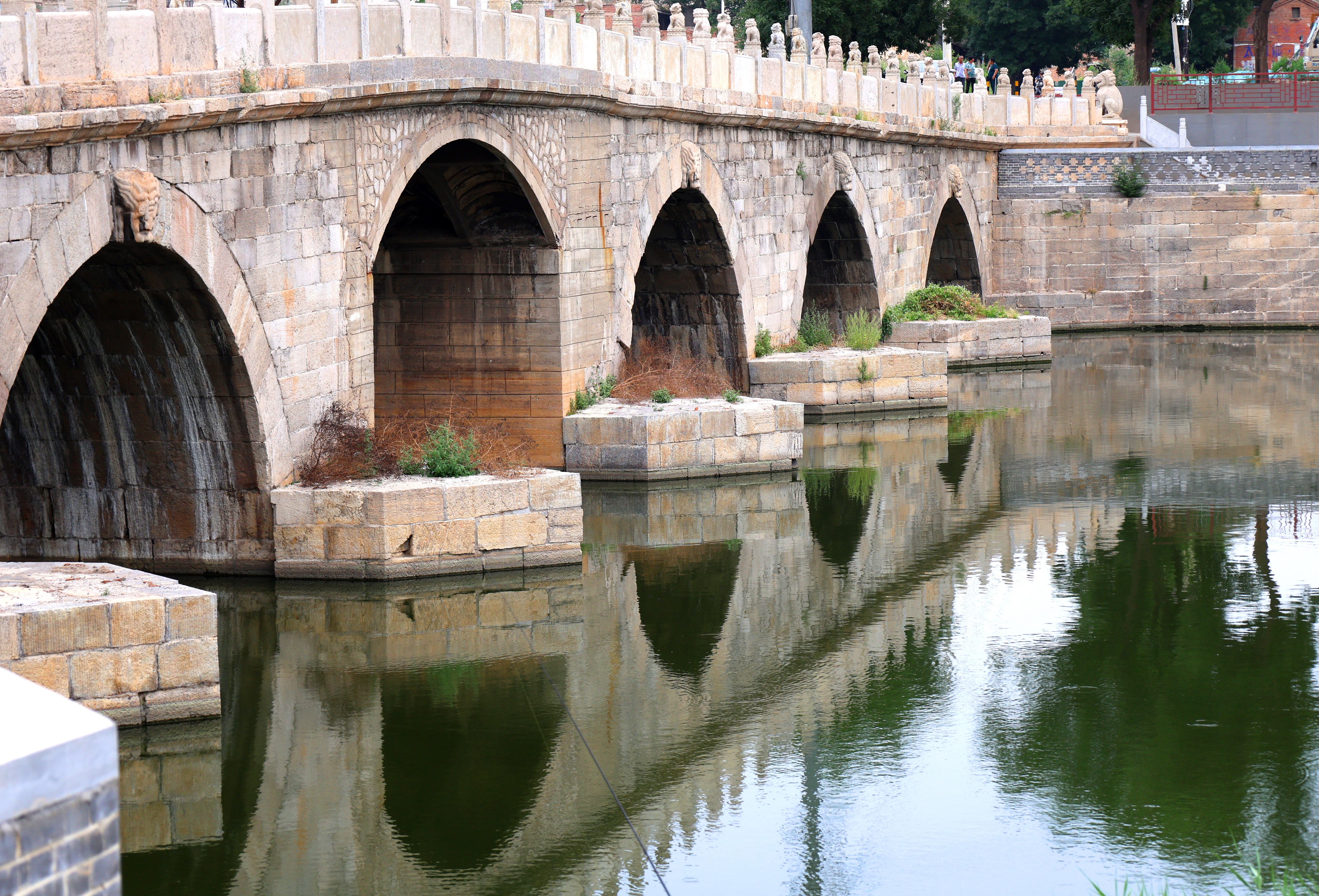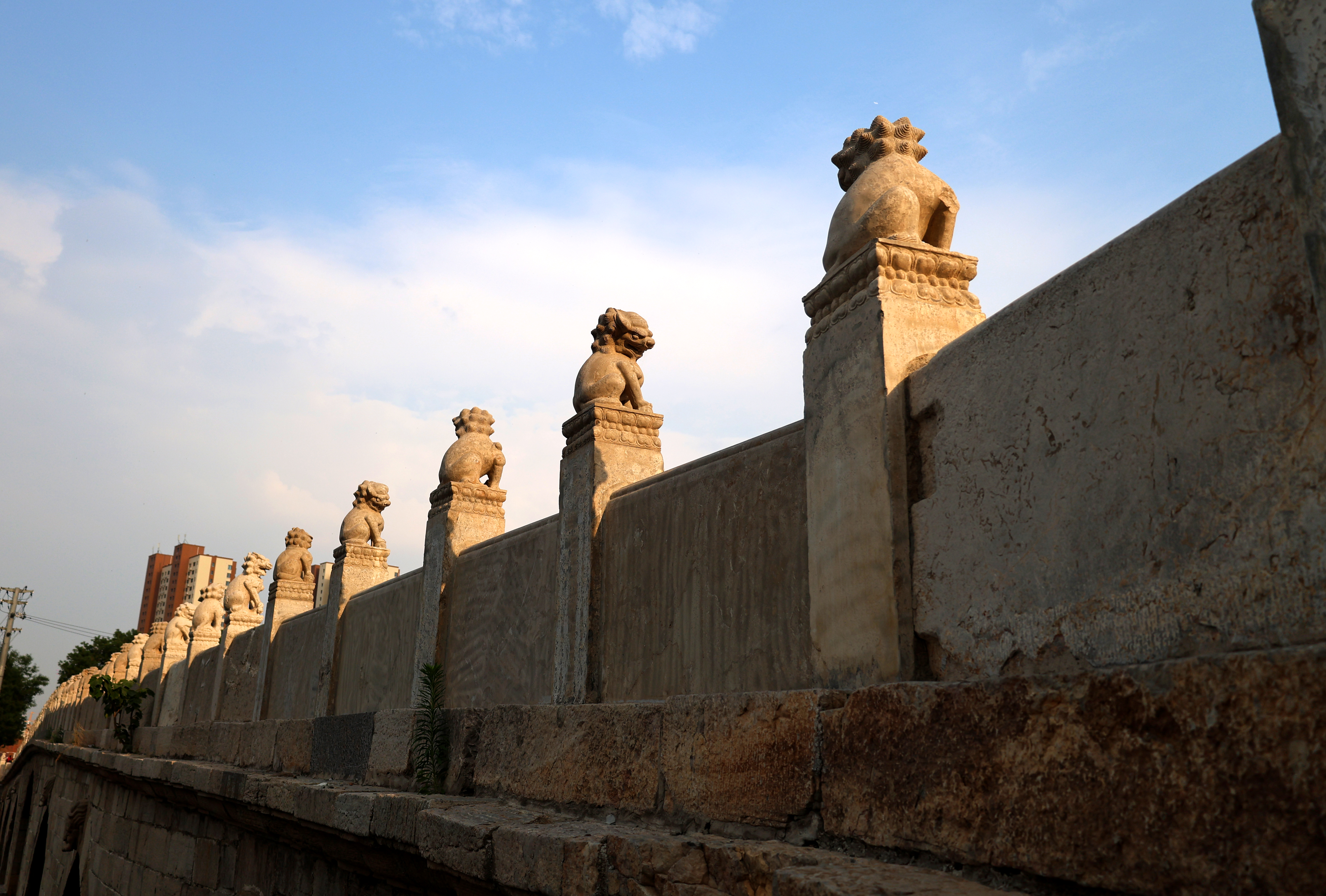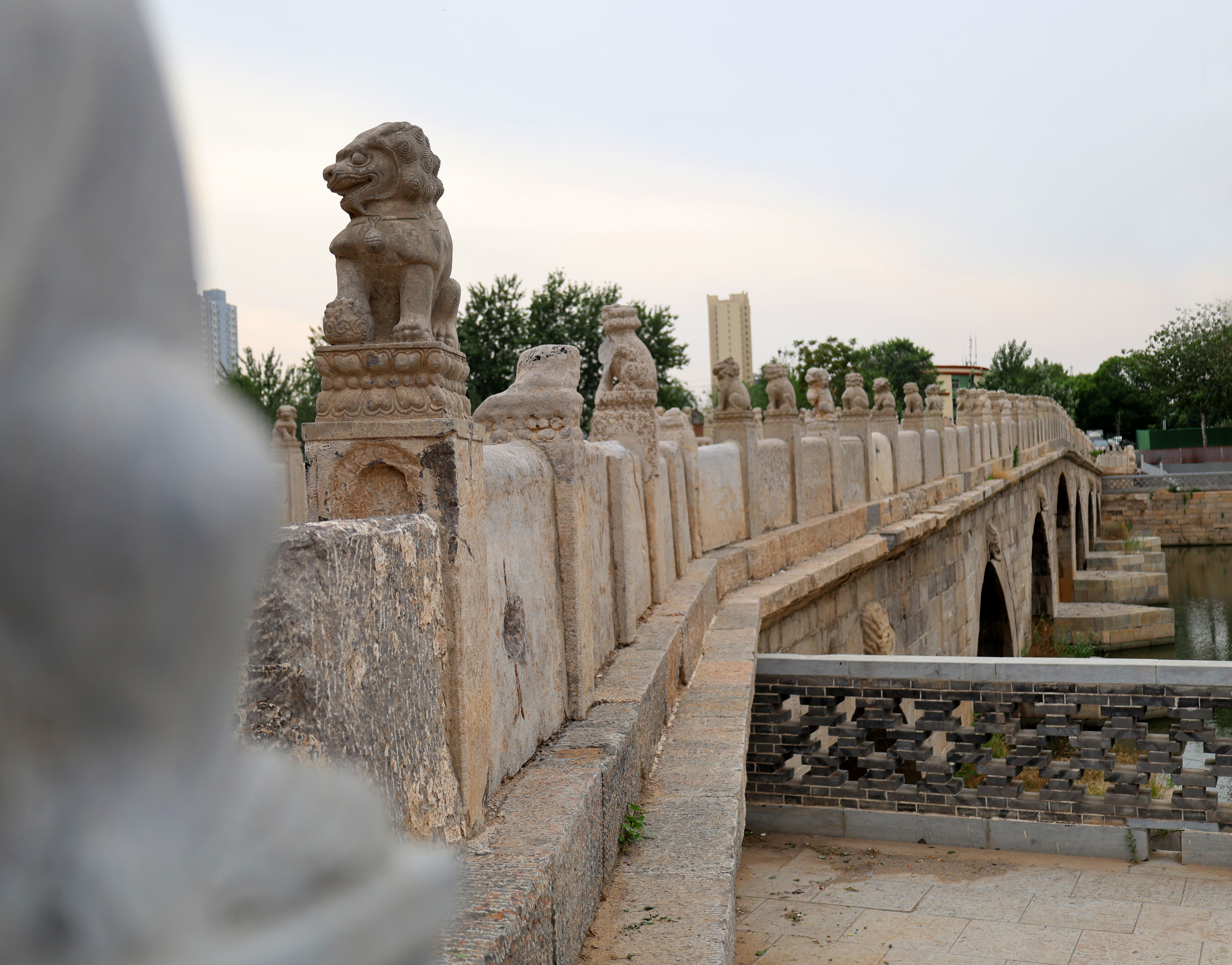踏上安济桥,脚下那宽阔而厚重的石板仿佛在轻声低语,叙说着往昔的悠悠岁月。引人注目的那两道平行延伸的车辙沟,呈现出沧桑古朴的历史风貌。车辙最深处达10余厘米。桥两侧的护栏上,58根石望柱整齐排列,望柱顶上的石狮子活灵活现。它们两两相对,姿态各异,有的项戴铃铛,有的项戴缨穗,有的张口怒目、威风凛凛,有的前足下踩一绣球,活泼俏皮,有的前足下踩一小狮,慈爱温馨。每一只石狮子都别具一格,或憨态可掬,或威风八面,其形态之丰富令人惊叹。望柱间镶嵌的石栏板上有浮雕卷云纹图案,尽显当时工匠的高超技艺。桥东西两端各置一对石狮,威风凛凛地守护着石桥的安宁。望向桥的侧面,每座桥墩处砌有棱锥形分水石,每个拱形桥孔的正上方(中孔除外)雕有一只龙头吞水兽。据民间传说,吞水兽具有抵御洪水、调节旱涝的神奇功效。由于安济桥历经两百多年的风雨侵蚀和磨损,桥上石狮和石栏板上的图案出现了风化破损的状况,岁月造就的残缺美独具韵味。