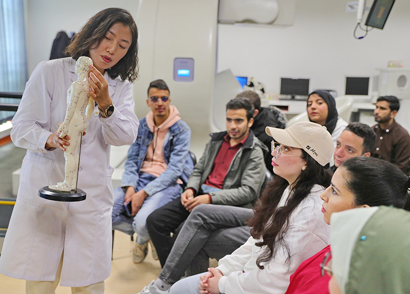 2023年4月19日,河北省秦皇岛市中医医院医务工作者为燕山大学外国留学生讲解中医经络知识。