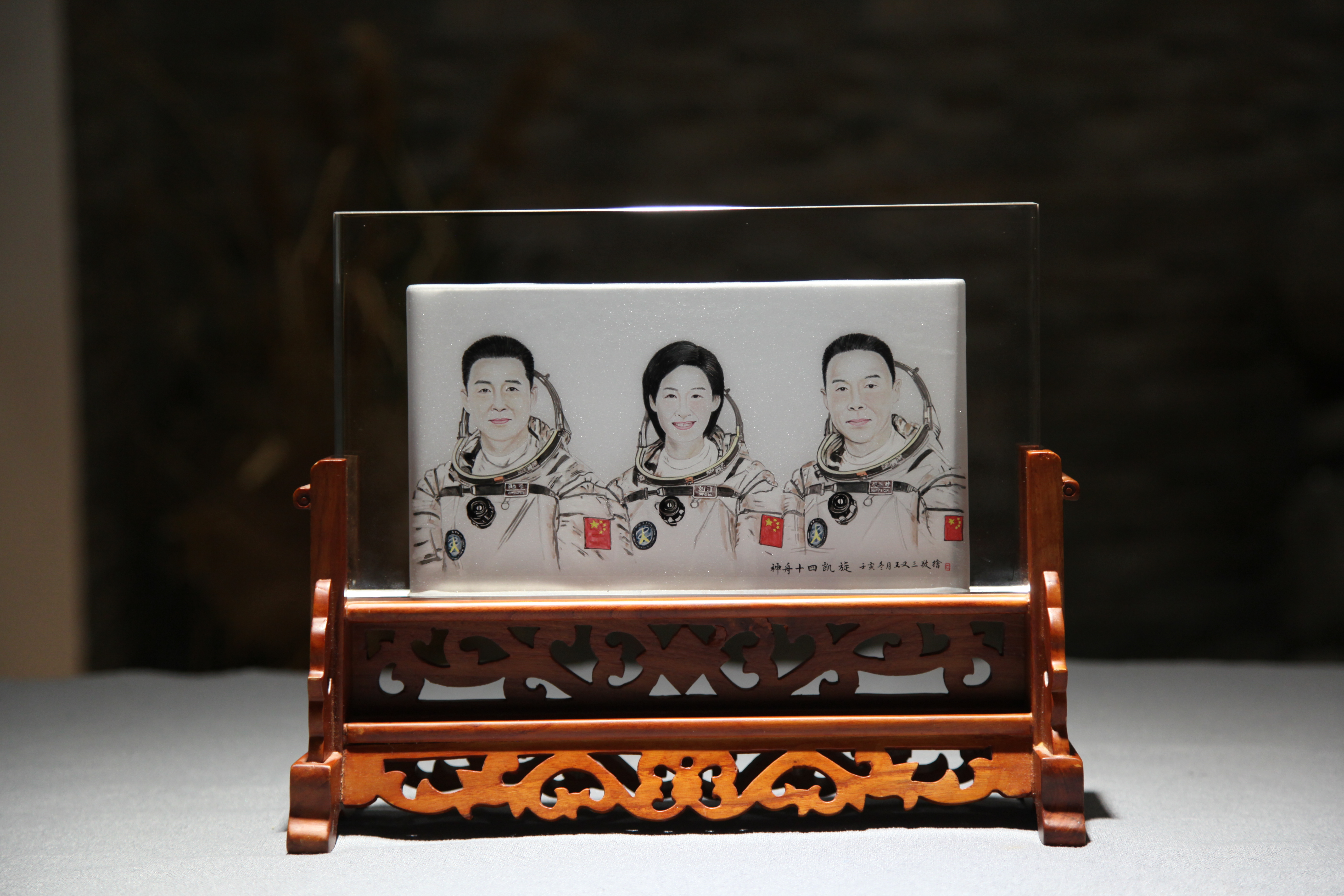 内画《逐梦苍穹》系列 由国家级非遗衡水内画省级代表性传承人王自勇创作,由一个内画屏风和三个内画鼻烟壶组成,正面为陈冬、刘洋、蔡旭哲三位航天员的肖像,背面采用油彩技法表现星空和徽章,展现出航天英雄不畏艰险、勇于突破、超越自我、无私奉献的精神,歌颂了中国航天事业取得的伟大成就。