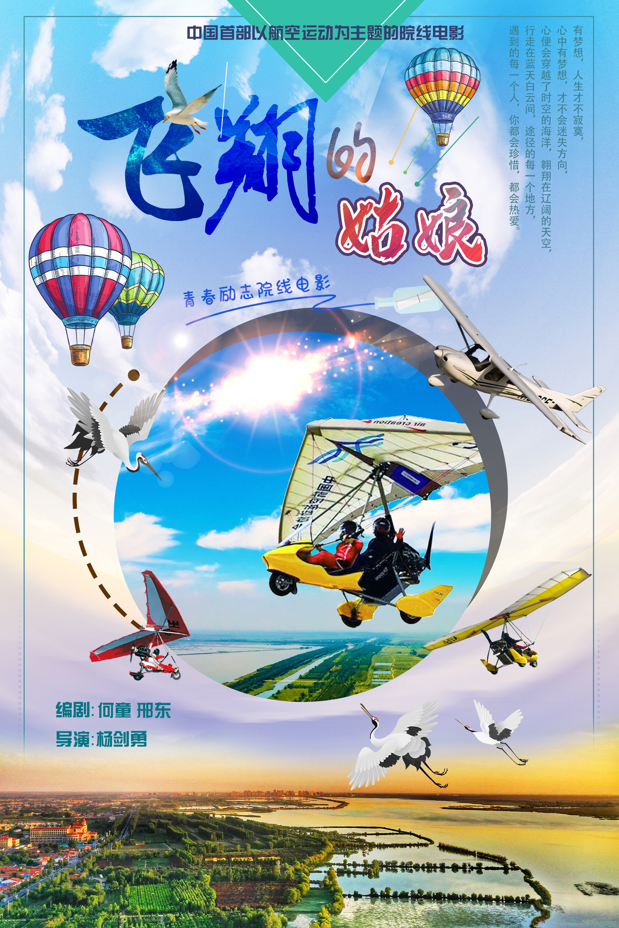 电影剧本《飞翔的姑娘》 由桃城区委宣传部组织创作,何童、邢东任编剧,河北威影影视有限公司拍摄,是中国首部航空运动主题电影,反映了北京姑娘来衡水航空飞行营地学习低空飞行发生的一系列故事,展现了年轻一代有梦想、敢追求、不惧艰险昂扬向上的良好精神风貌,同时宣传了衡水湖的美丽景色和衡水人高度的环保意识,是京津冀协同发展大背景下,反映时代精神和地域特色的青春励志电影。目前该剧已在国家电影局备案立项,正进行剧本打磨、角色筛选等前期准备工作。