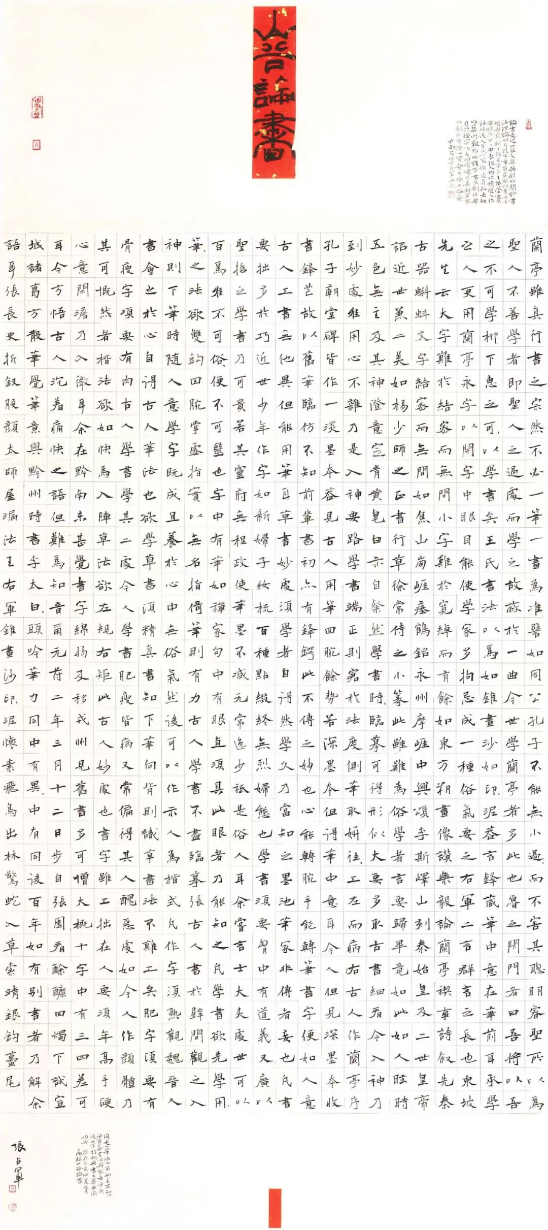 书法《山谷论书》 是张占军创作的楷书作品,也是2019年全国第十二届全国书法篆刻展入展作品,当时楷书、行书、草书三件作品同时入展的书法家全国共八人,河北仅张占军一人。适逢新中国成立70周年,作品以端庄的唐楷欧书为主基调,加入魏碑率意,作品上部的疏空和主题内容的密集形成强烈对比,最后用大红标签粘于顶部彰显盛世气象。