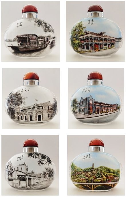 内画《红船精神》系列套壶 由中国工艺美术大师、衡水一壶斋工艺品有限公司创始人张汝财创作,以衡水内画这一国家级非遗传统绝艺,绘制《红船精神》《遵义会议》《中共一大会址》《中共二大会址》《中共三大会址》《革命圣地延安》等6件系列内画套壶,系统展现中国革命历程中的重大标志性事件、会议、场景等。2021年6月,该作品参加“红船精神——中国工艺美术大师作品展”,并荣获中国工艺美术大师“百名大师、百件作品”红色主题展突出贡献奖。