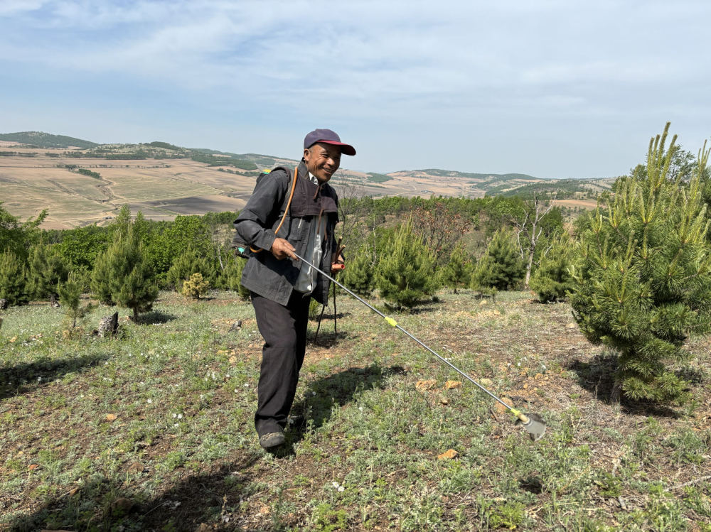 一边登山一边喷洒除草剂,王武山顺着林间的崎岖小路,登上了山顶。摩挲着茁壮生长的松树苗,他满眼欢喜:“荒山变绿了,没有白辛苦啊。”