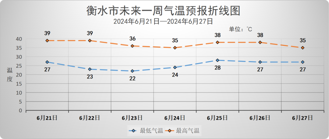 具体天气预报为:6月21日,阴有雷阵雨转多云,西南风2级转,西北风3~4级,气温:34到23℃;6月22日,多云转晴,西北风4~5级,气温:39到23℃;6月23日,多云,北风3~4级,气温:36到22℃;6月24日,晴间多云,气温:35到24℃;6月25日,晴间多云,气温:38到28℃;6月26日,多云转晴,气温:38到27℃;6月27日,多云,气温:35到27℃。