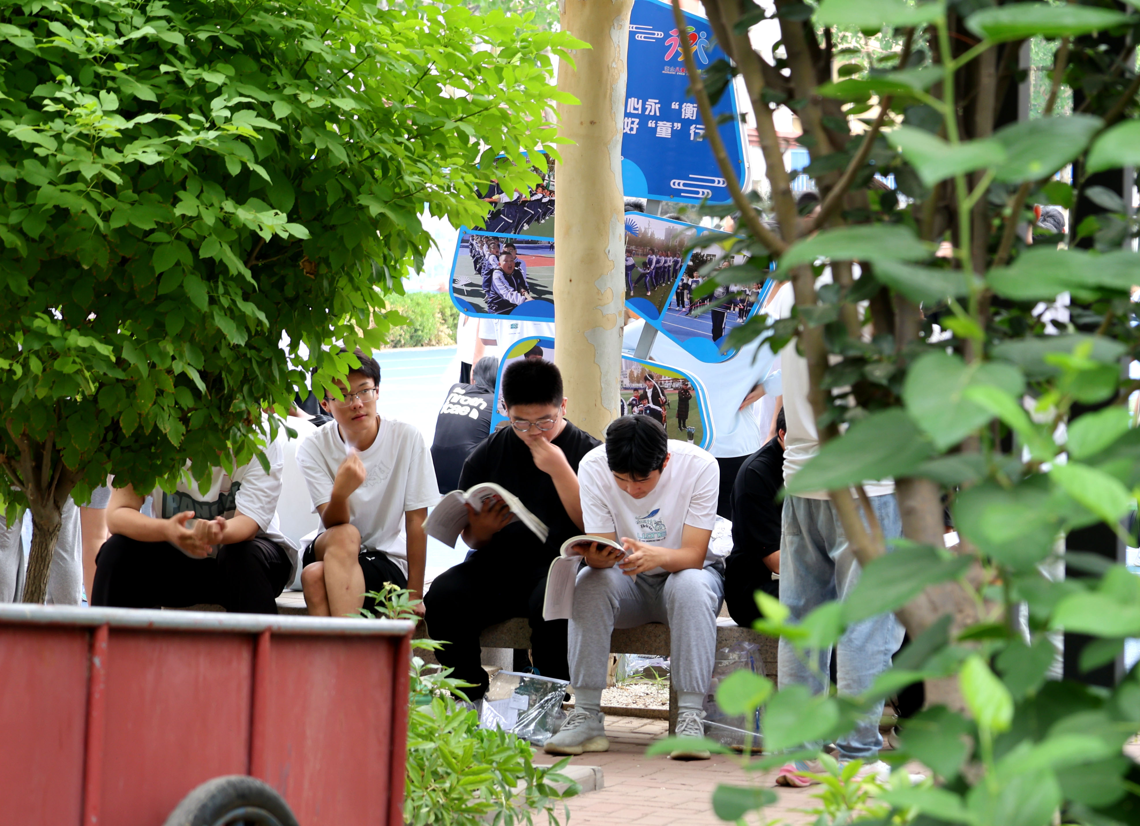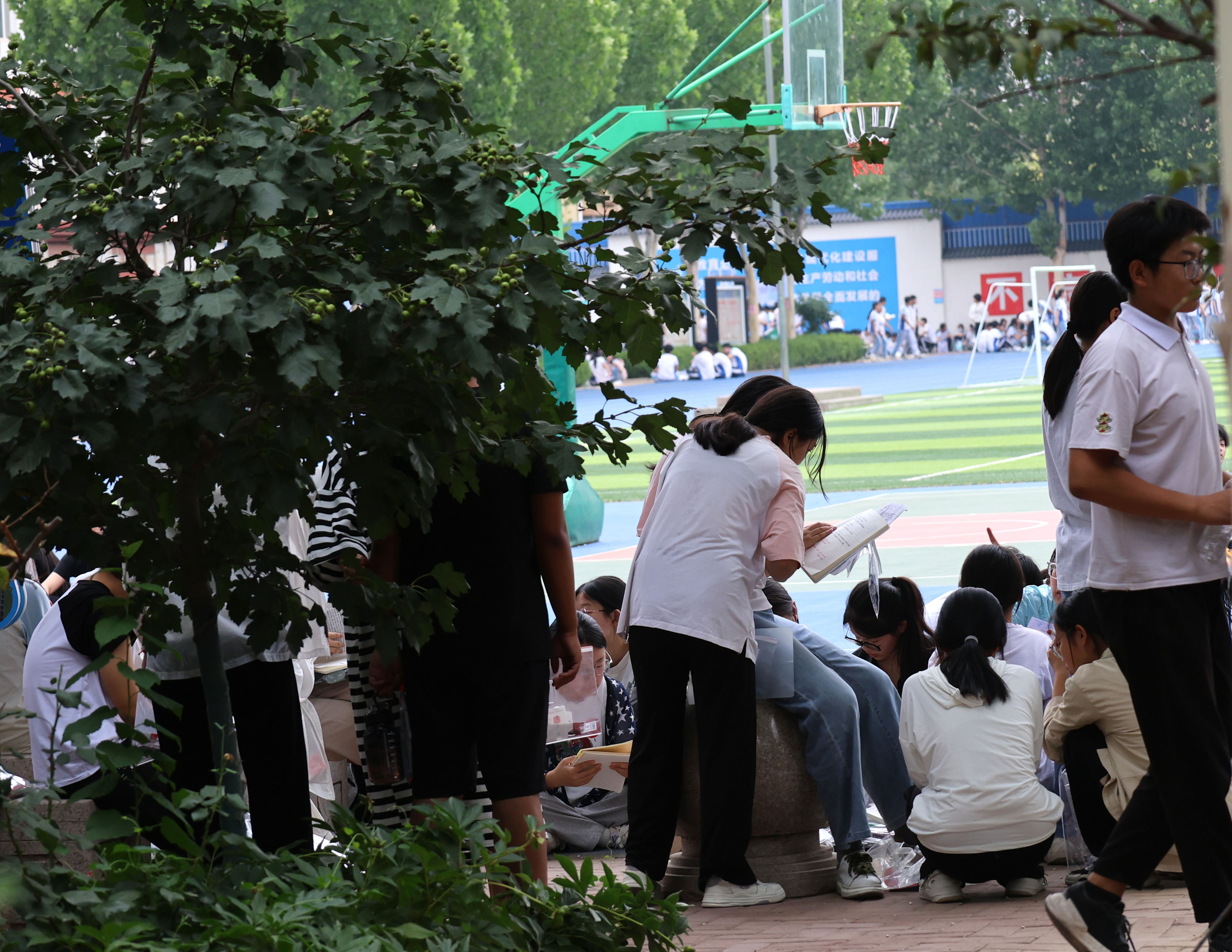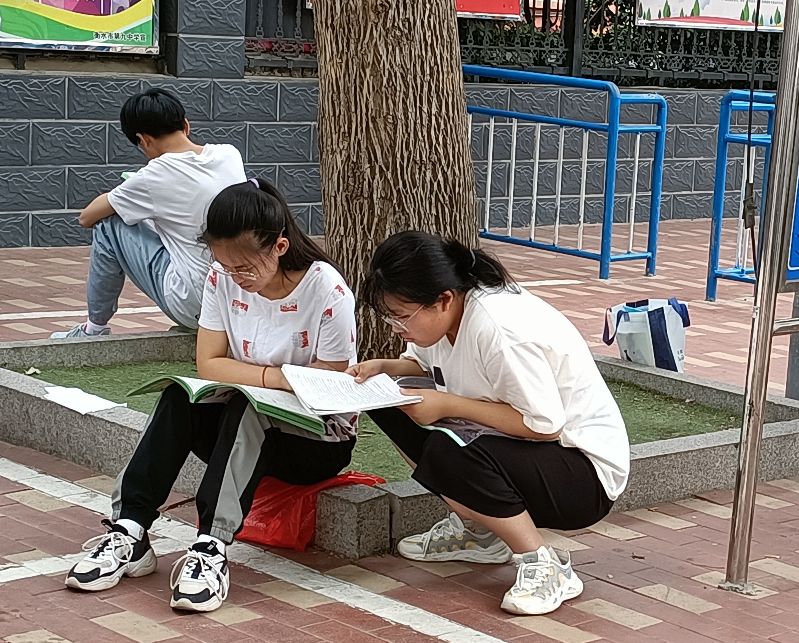 稍后,考生们陆续进入考点内的操场上。只见他们三五成群,趁着这最后的珍贵时光,纷纷拿起课本,与同学共同复习,做着最后的冲刺。