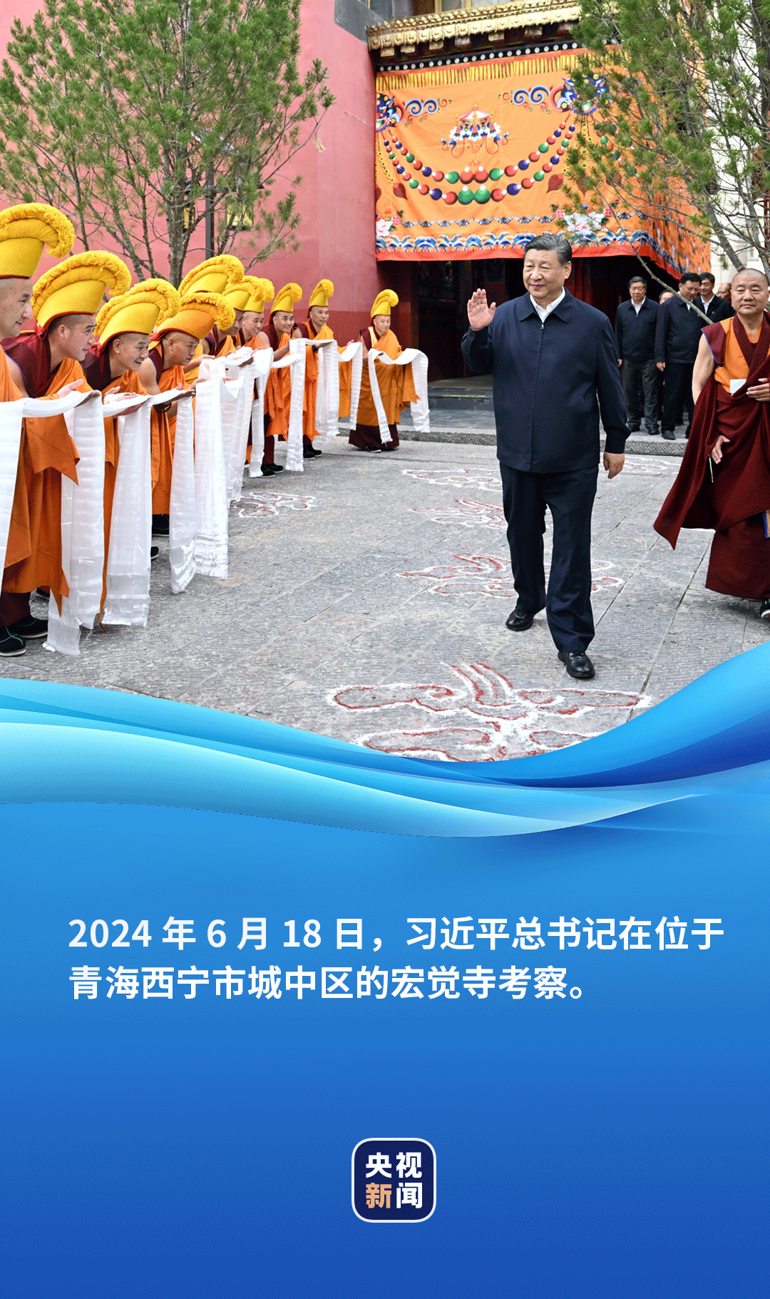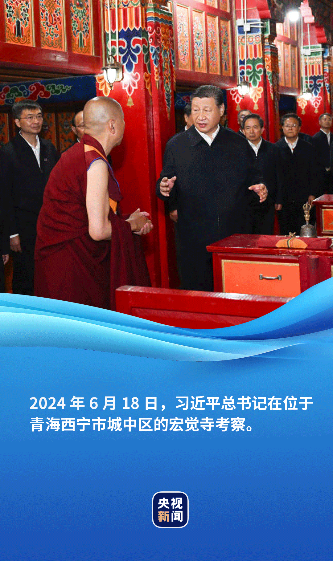 6月18日,正在青海考察的习近平总书记来到位于西宁市城中区的宏觉寺。在寺前院落,宏觉寺民主管理委员会负责人向总书记敬献哈达,僧人提香炉、持宝伞迎接总书记。