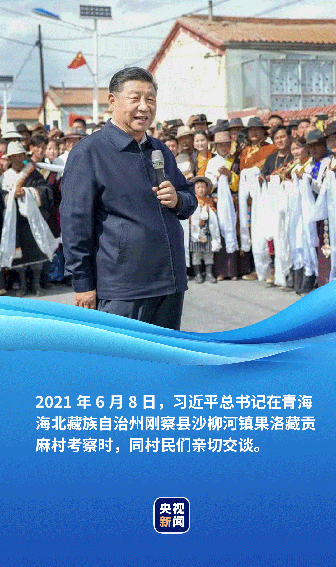 蓝天白云下,一排排红瓦黄墙的平房小院错落有致,笔直整洁的村道两旁立着太阳能路灯。村民索南才让带着一家三代站在家门口,向总书记献上洁白的哈达。