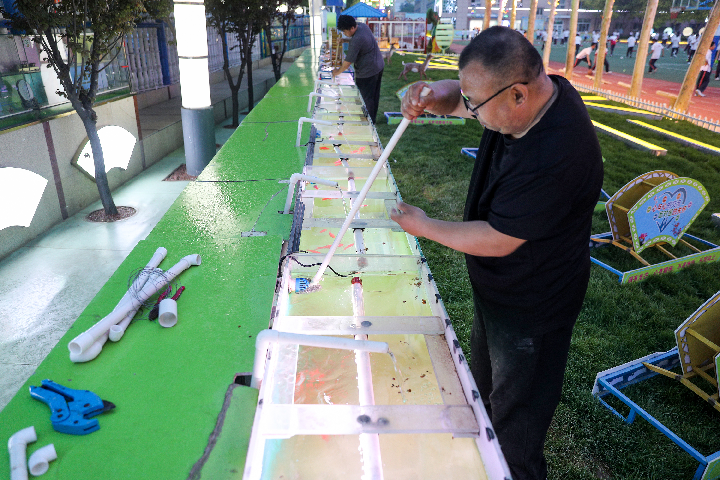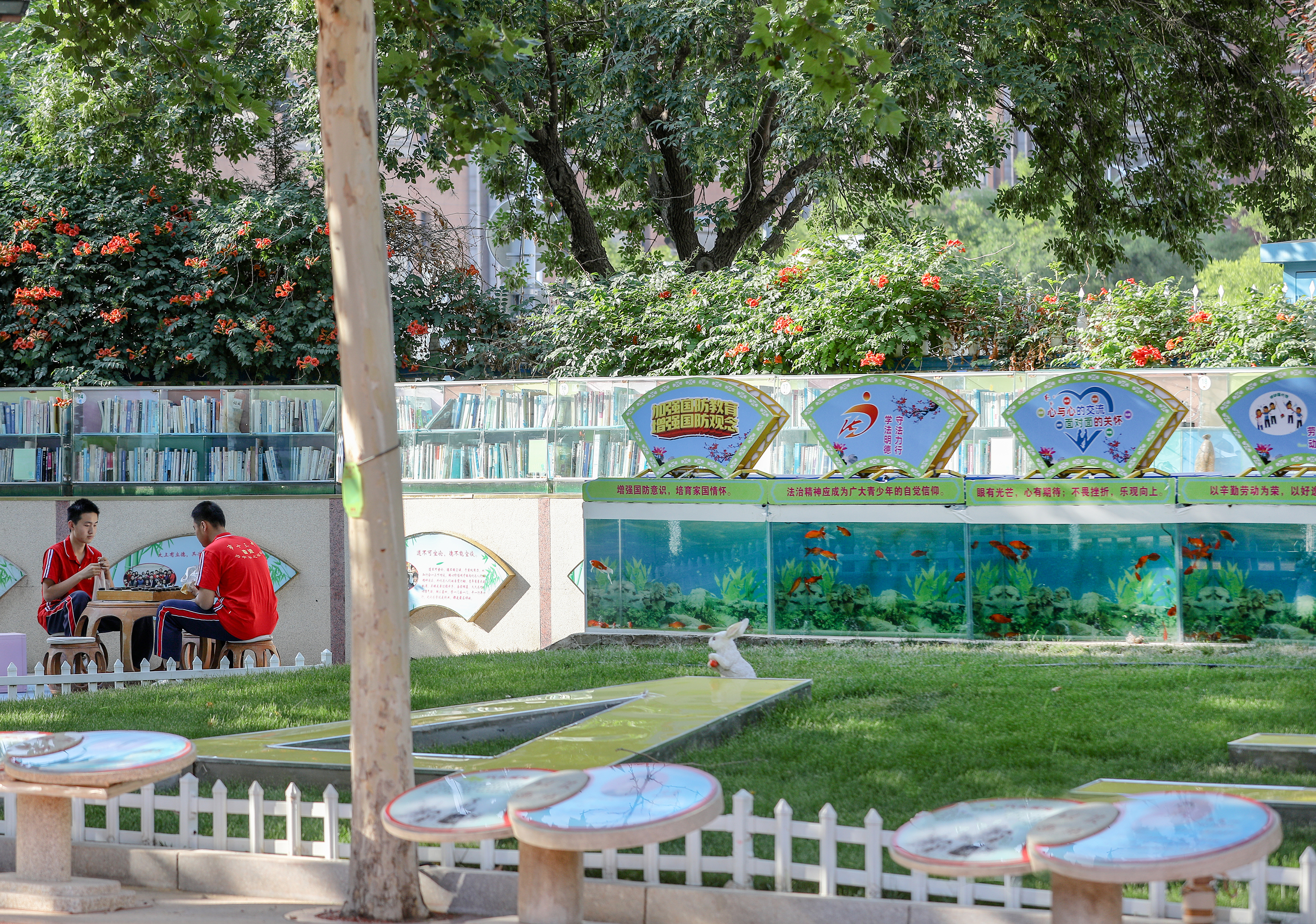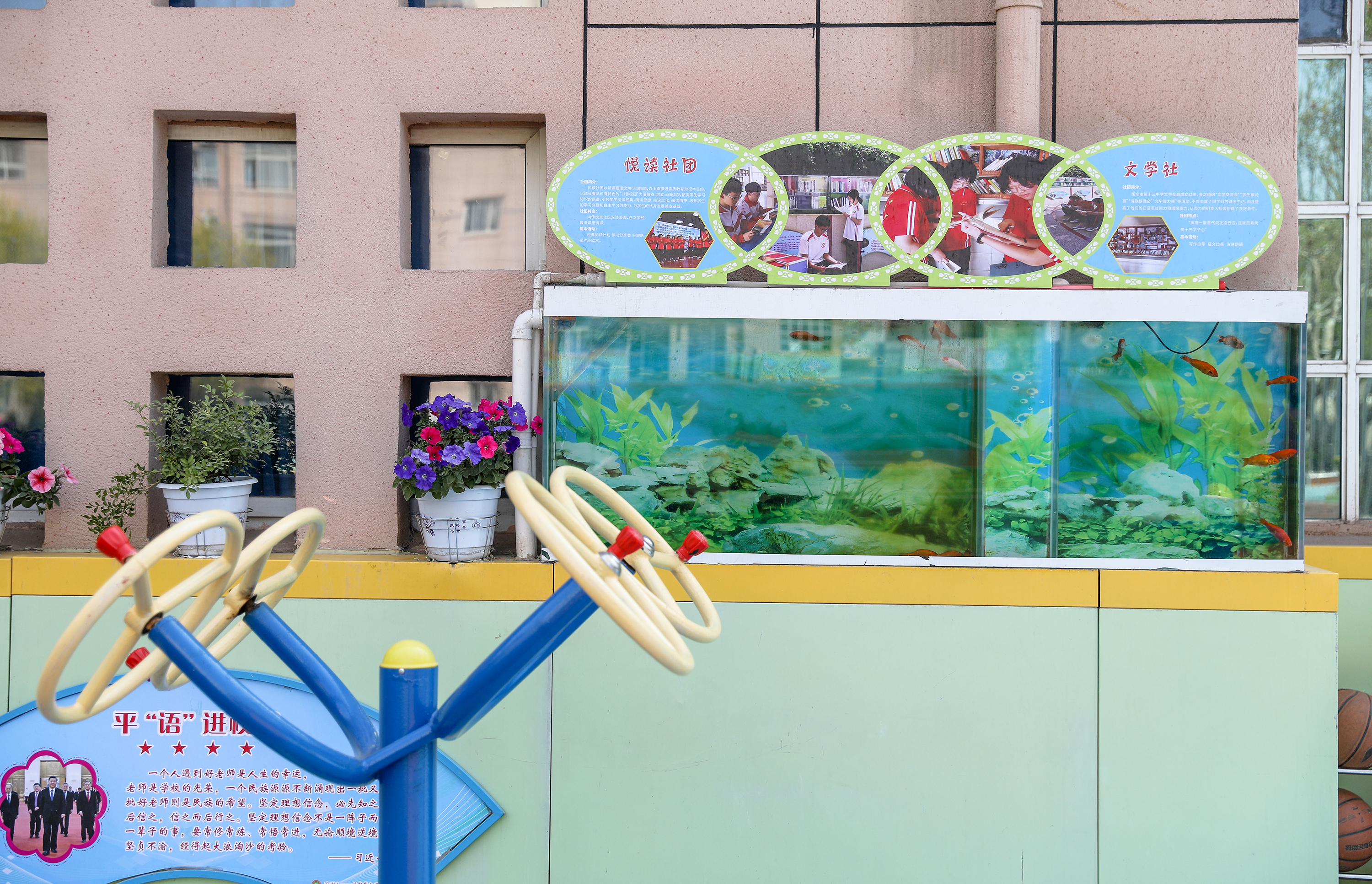 在衡水市第十三中学操场南面,呈现在师生面前的是一处靓丽风景线——21米的超长大鱼缸,数字“21”代表着学生们高一高二两年的沉淀自我、潜心成长的生活,和一年高三超越自我、实现突破的生活。大鱼缸内部又分成了17个小鱼缸,代表在整个三年历程中,学校根据普通高中课程方案,开足开齐17门国家课程。它们各自独立,又息息相关。