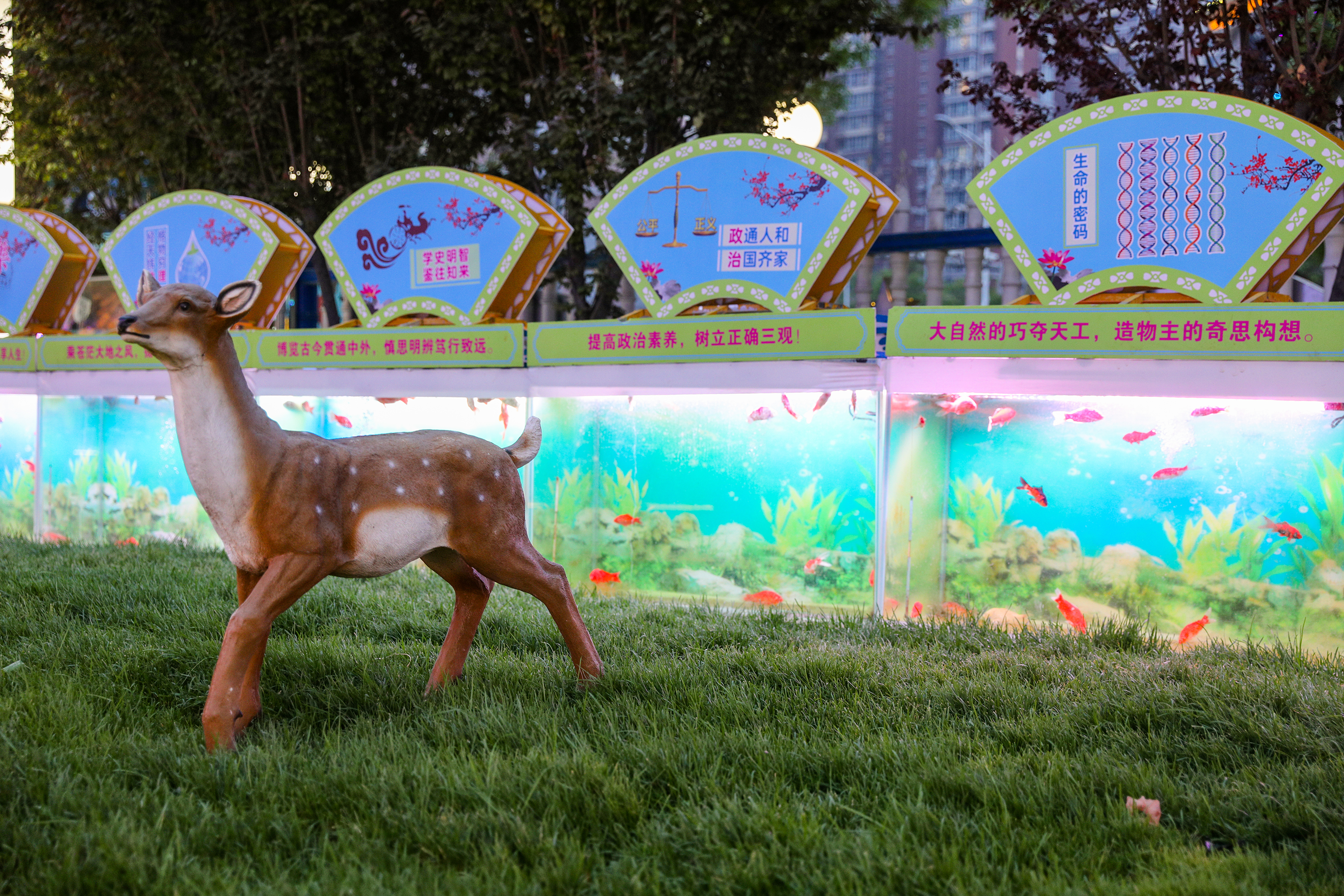 教学楼窗台边是另一处独特的风景区——小窗鱼缸,每个小窗鱼缸代表着一个社团,上面制作了精美的代表36个社团的文化介绍。