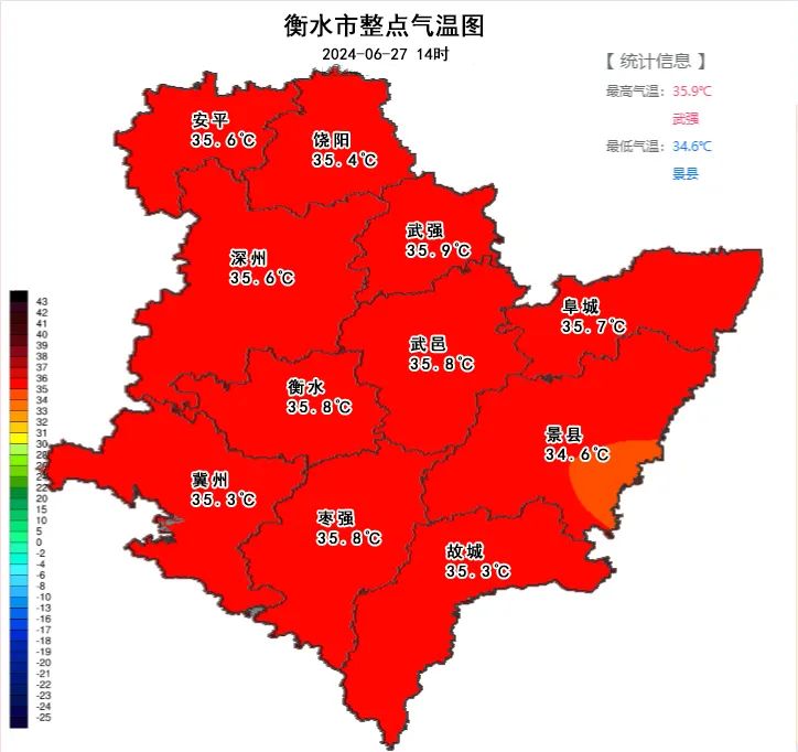 今天我市继续高温在线,热力十足,午后二时,全市气温除景县外,其它县市都超过了35℃高温线。走在户外体感炎热,紫外线较强,市民朋友要注意做好防暑降温工作,同时要注意做好防晒工作。