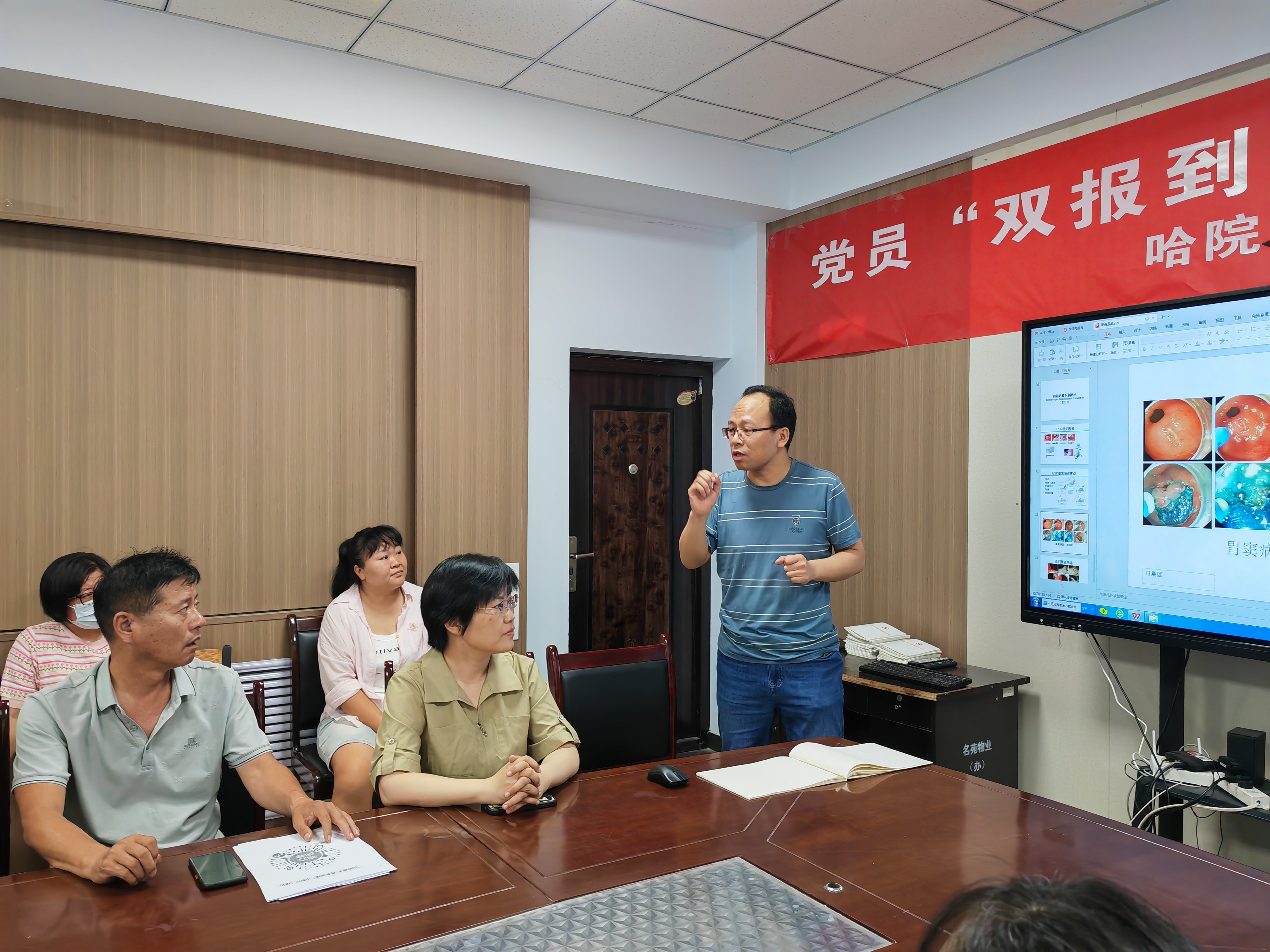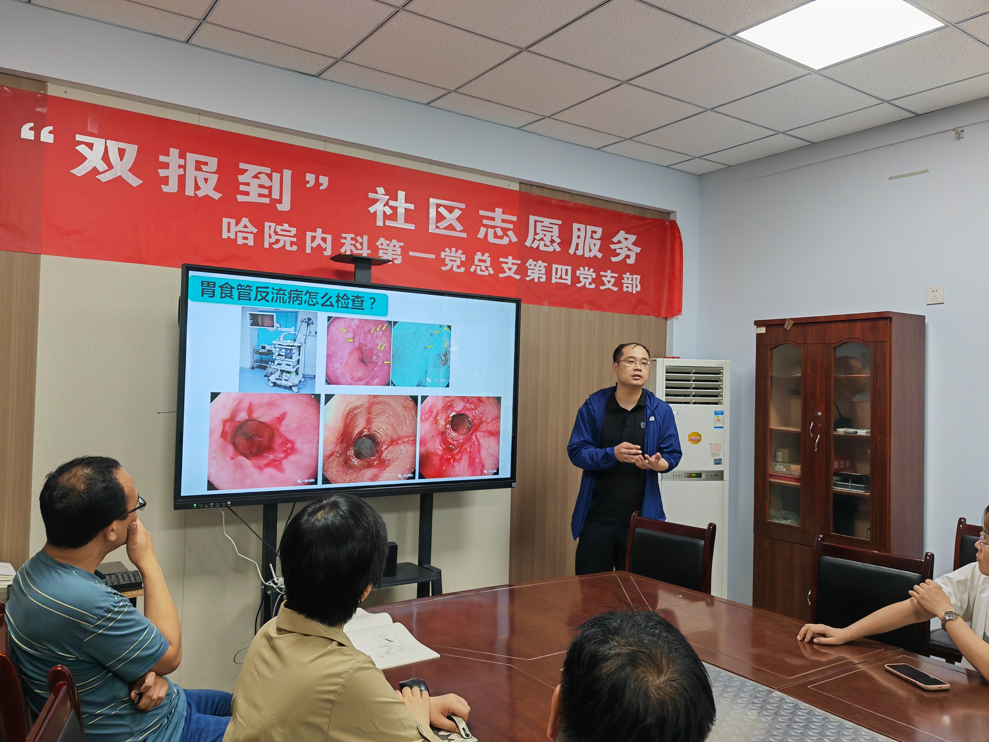 消化道早癌,是指浸润深度不超过粘膜下层或局限于粘膜层的消化道癌症,包括早期食管癌、早期胃癌,而不论其大小及是否有淋巴结转移。消化道早癌的症状就是没有症状,一般肿瘤发展到中晚期才会出现一些较为明显的症状。“早预防、早筛查、早诊断、早治疗”是消化道癌防治的关键,哈院消化内科在早癌防治方面走在了前列。消化内镜检查,能早期发现和诊治消化道早癌及癌前病变。通过特殊的光染色及放大技术,将可疑病灶放大几百倍,让胃肠道早期病变凸现出来并放大,避免初期无症状的胃肠道早癌被忽视。而国家卫健委胃癌筛查与早诊早治(2024年版)方案中明确,胃肠镜是筛查消化道癌症的金标准。哈院消化内科医生苏淼,是哈院博士团的重要成员,因突出表现而被评为优秀党员。他细致讲解了消化道早癌防治,并就在全省率先成功开展内镜黏膜下剥离术等,进行了精彩讲解。在讲解时,有居民就就医过程中遇到的问题,苏淼给予贴心答疑。
